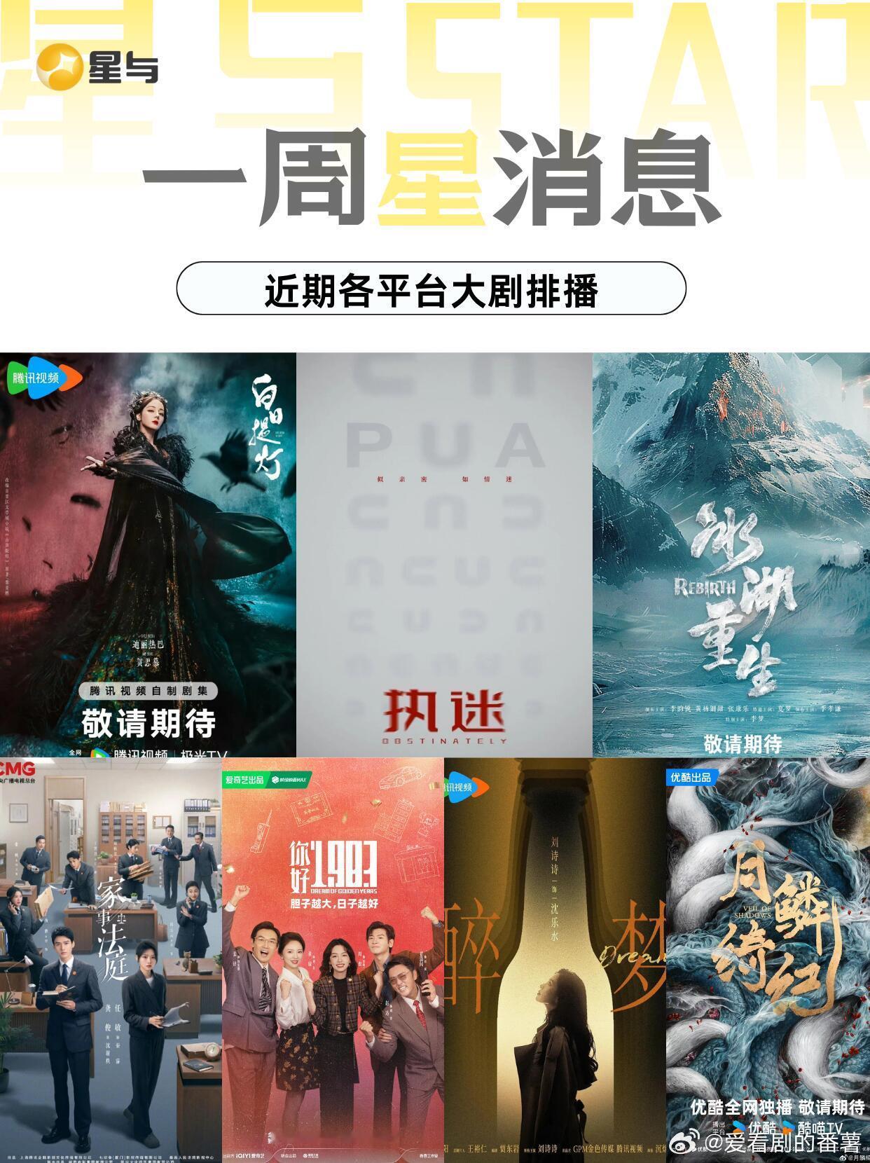 一周星消息|3-4月不剧荒,坐等新剧开播!🥝:《你好 1983》周也、翟潇闻|预计 3 月 13 日《擒贼记》王骁、田曦薇、王传君|定档 3 月 22 日《危险关系》孙俪、吴慷仁|预计 3 月 30 日《冬去春来》白宇、章若楠、林允、王彦霖|预计 4 月初《冰湖重生》李昀锐、黄杨钿甜|预计 4 月 9 日《从警生涯》张晚意、姜武、张天爱|预计 4 月中旬《佳偶天成》任嘉伦、王鹤润|预计 4 月《高兴》白宇帆、于文文|预计 4 月《心诉》王阳、孙千、谢可寅|预计 4 月🐧:《她的盛焰》马思纯、宁理、翟子路|定档 3 月 13 日《家事法庭》龚俊、任敏|预计 3-4 月《叵测》刘烨、聂远|预计 3 月《隐身的名字》倪妮、闫妮、刘雅瑟|预计 3 月《夜色暗香》李汶翰、鹤男|预计 3 月《白日提灯》迪丽热巴、陈飞宇|预计 3 月下旬《冰湖重生》李昀锐、黄杨钿甜|预计 4 月《醉梦》刘诗诗、李乃文、李沁|预计 4 月《待我醒来时》景甜、张新成|预计 3-4 月《方圆八百米》许凯、丁勇岱、邓恩熙|预计 4 月👖:《正义女神》佘诗曼、谭耀文|预计 3 月《月鳞绮纪》鞠婧祎、曾舜晞、陈都灵、刘宇|预计 4 月《悬案》岳云鹏、王传君|预计 4 月《黑夜告白》潘粤明、王鹤棣、任敏|预计 4 月《此处通往繁星》郭麒麟、张雪迎、王鸥|预计 4 月🥭:《你是迟来的欢喜》魏哲鸣、郑合惠子|预计 3 月底《花好》周依然、王子奇、徐梦洁|预计 4 月
