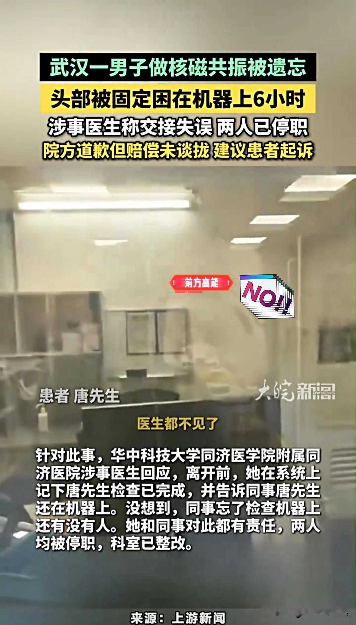 谁能想到啊!武汉一男子去同济医院做核磁共振,直接被医生忘在机器里整整6小时!从凌晨困到清晨,喊到嗓子哑都没人理,最后还是保洁阿姨打扫才发现他还在里面躺着! 这操作离谱到什么程度?医生交接全靠嘴,系统里直接标“检查完成”,转头就把活人给忘了!合着患者不是来做检查的,是来体验“沉浸式幽闭6小时”的是吧?手机被收走,头被固定着,喊破喉咙都没人应,换谁不得吓出心理阴影? 更绝的是后续处理:涉事医生停职,院方道歉,但赔偿谈不拢就让人家去起诉?合着犯了错就一句“对不起”,剩下的全让患者自己扛?这流程漏洞大到能跑马,把患者安全当儿戏,这医院的管理是真让人捏一把汗! 说句难听的,哪怕是寄个快递还得扫码确认签收呢,怎么到了患者身上,就能这么轻飘飘地“忘了”?医疗安全不是喊口号,是要把每一个患者都放在心上啊!这事儿要是没曝光,是不是还得有下一个“被遗忘的人” 对于此事你们怎么看? 武汉男子核磁共振被困6小时 离谱的医疗事故