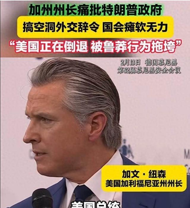 很多人不理解,说加州州长为什么总是抨击美国总统,他不怕美国总统撤了他吗?实际上还真的不怕!很多人可能不知道,加州州长跟美国总统一样,实际上是被人选举出来的。美国总统并无权去任命州长,实际上,唐纳德连纽约的市长都无权任命。两者并不是上下级的关系。所以加州州长纽森,从来都不怕唐纳德。两人总是针锋相对! 美国的政治制度从宪法层面就把联邦和州分得很清楚。总统是全国选出来的,州长是本州选民单独选出来的,两边根本不是上下级。总统没法直接撤换州长,也没权力任命州长,这点在联邦宪法第十修正案里写得明明白白:宪法没给联邦的权力,就归各州或者人民。加州州长纽森跟特朗普的对峙,根子上就是这个制度设计决定的。特朗普再怎么发脾气,也动不了纽森的位子,除非走弹劾程序,但那得州议会自己动手,而且门槛极高,几乎不可能因为政策分歧就启动。 纽森从2019年当上加州州长开始,就把加州定位成跟联邦对着干的先锋。加州人口最多、经济体量排全球前五,GDP比很多国家都大,它有底气不听联邦那一套。特朗普第一任期时就因为移民、环保、枪支这些议题跟加州杠上了。加州通过“庇护州”法律,限制地方警察配合联邦移民执法;环保上加州继续推严格的碳排放标准和零排放汽车目标,哪怕联邦环保署放水也照推不误。到特朗普第二任期,2025年以后,这种对抗更明显。加州在气候变化、人工智能监管、数据隐私上继续往前冲,联邦往后退一步,加州就往前迈一步。从2020年算起,加州通过了二十多条跟联邦政策唱反调的法律,这些都不是空话,是真金白银砸下去的立法和执行。 2026年2月在慕尼黑安全会议上,纽森公开点名特朗普,说他的政府在气候问题上倒行逆施,把美国在清洁能源赛道上的领先优势拱手让人。这话不是随便说说,加州自己搞的电动车强制上牌比例、充电桩建设、清洁能源发电目标,已经跑在全美前面。纽森直接讲特朗普的政策等于背叛美国汽车产业,让中国等对手占便宜。特朗普团队那边当然不爽,但也只能嘴上怼回去,比如给纽森起外号“Newscum”,或者在记者会上阴阳怪气说纽森的主要罪行是竞选州长。纽森回击也很直接,说有本事就冲他来。这些你来我往的嘴仗,背后是实打实的权力博弈。 不止嘴上说,加州还拉帮结派。2025年十几个民主党控制的州搞了个“宪法韧性联盟”,一起请律师、打官司,专门对付联邦政府乱伸手。加州额外拨款支持科技公司和实验室,帮它们绕过联邦限制。特朗普那边则推“逃离加州”活动,鼓励企业搬到得州、佛州去避税避监管。两边动作都挺大,但加州经济体量摆在那,科技巨头扎堆,短期内搬不走多少。加州还继续在移民保护、公共卫生、枪支管控上单干,联邦想统一标准也卡不住。 这种州跟联邦的拉锯在美国历史上不算新鲜事。联邦制本来就设计成分散权力,避免中央一家独大。加州作为蓝州大本营,人口和经济优势让它有资本硬刚。特朗普执政风格强势,喜欢全国一盘棋,但宪法框架限制了他对州的控制力。纽森抓住这个制度空隙,把加州当成民主党未来的试验场,也为自己积累全国声望。国际场合他敢公开拆台特朗普,欧洲人听着觉得美国内部乱,但也有人觉得这恰恰证明民主还有点韧性。