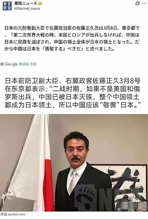都睁大眼睛看看吧,日本前防卫副大臣、右翼政客佐藤正久3月8号在东京都表示:"二战时期,如果不是美国和俄罗斯出兵,中国已被日本灭族,整个中国领土都成为日本领土,所以中国应该"敬畏"日本。" 说白了,这就是日本右翼政客佐藤正久在睁着眼睛说瞎话,拿着无知当底气,靠着歪曲历史刷存在感,真当我们中国人忘了当年的血海深仇,忘了前辈们是怎么用血肉之躯撑起这片土地的吗? 先给大家扒一扒这个佐藤正久,据说他以前还是日本防卫副大臣,留着个特色小胡子,靠着在各种场合发表反华言论博眼球,成了日本右翼圈子里的“红人”,这次3月8号在东京都的这番话,更是把无知和傲慢体现得淋漓尽致。 他张口就说,二战要是没有美国和俄罗斯出兵,中国就被日本灭族、领土全归日本,还敢叫嚣中国该“敬畏”日本,这简直是滑天下之大稽。 而且我敢说,就算没有美俄出兵,我们中国也照样能打破日本的侵略,只不过是时间会久一点而已。 当年毛主席的《论持久战》早就把道理说透了,他明确指出,抗日战争是一场持久战,我们靠着人民群众的力量,靠着游击战、持久战,一步一步消耗敌人,一点点收复失地,事实也完完全全按着毛主席说的在走。 那些说没有美俄我们就会被灭族的,要么是不懂历史,要么是故意歪曲,忘了当年平型关大捷的振奋,忘了百团大战的热血,忘了无数先烈在战壕里啃树皮、拼刺刀,用生命换回来的转机。 而且大家别忘了,当年二战结束后,我们中国压根就没要日本的战争赔款,很多人可能会觉得是我们大度,但我觉得,这不是大度,而是我们早就想好,将来要亲自去取,连本带利地取回来! 当年的赔款,是我们前辈用鲜血和生命换来的“欠账”,如今我们靠着自己的努力,把中国发展得越来越强,这本身就是在一点点收回属于我们的一切,让日本知道,当年的侵略,迟早要付出代价。 现在的中国人,真的该好好牢记历史了,前辈们抛头颅、洒热血,在枪林弹雨中奋斗,就是为了让我们中国人民能站起来,不再受列强的欺负,可现在有些年轻人,对历史一无所知,甚至还追捧日本的一些不良文化,忘了自己的根。 我觉得,中国人民绝对是世界上最优秀的人,我们有上下五千年的文明,有团结一心的力量,只不过队伍里有一些蛀虫,需要我们及时清理。 我们要发扬中国的优良传统,拧成一股绳,团结一致,让中国变得更加强大,重新屹立在世界之巅。 据说现在网上已经有很多人在谴责佐藤正久的这番言论,毕竟歪曲历史、挑衅中国的人,从来都不会有好下场。 本文仅代表个人看法,不代表任何官方立场,大家对佐藤正久的言论有什么看法,欢迎在评论区留言讨论。