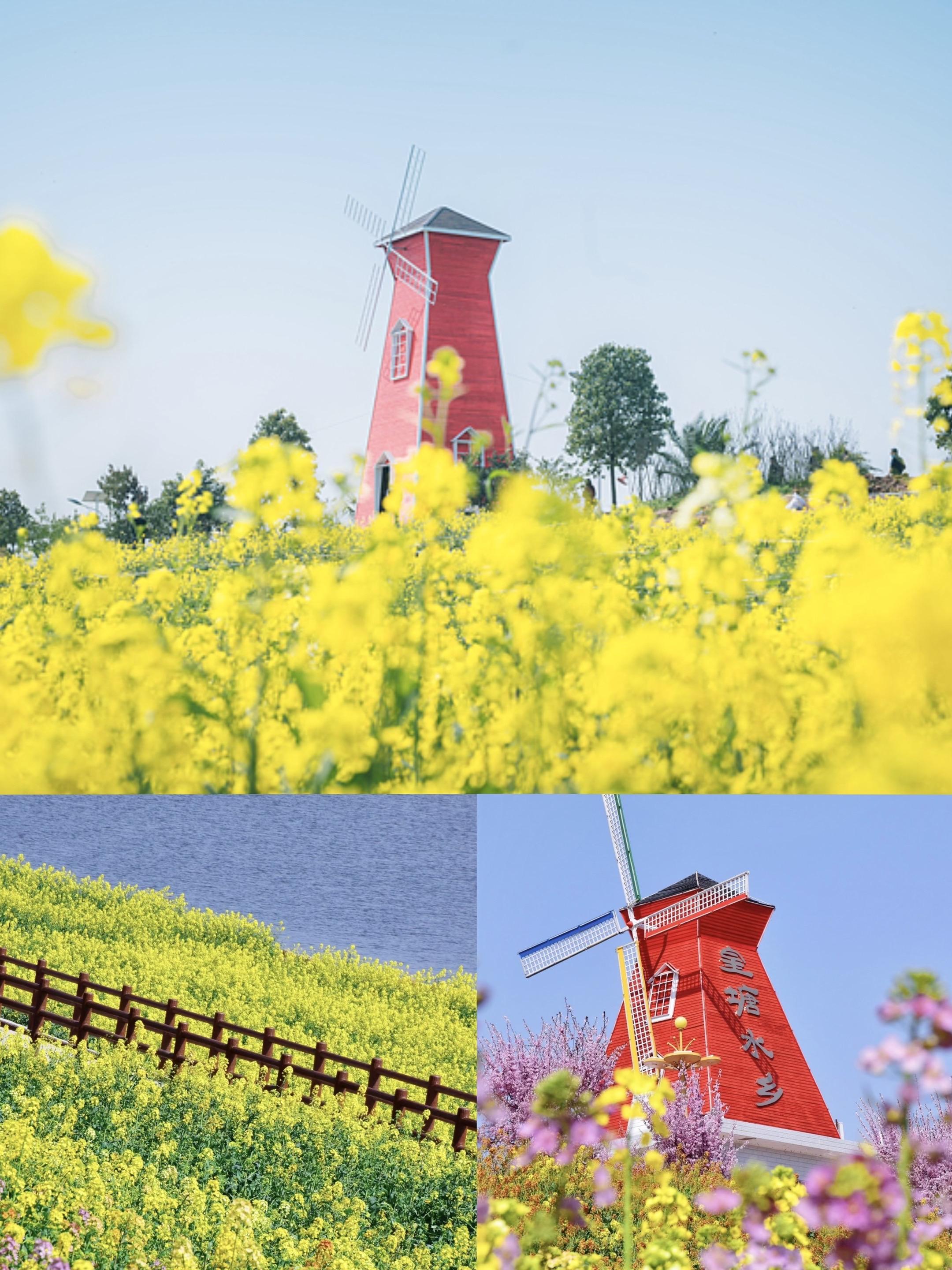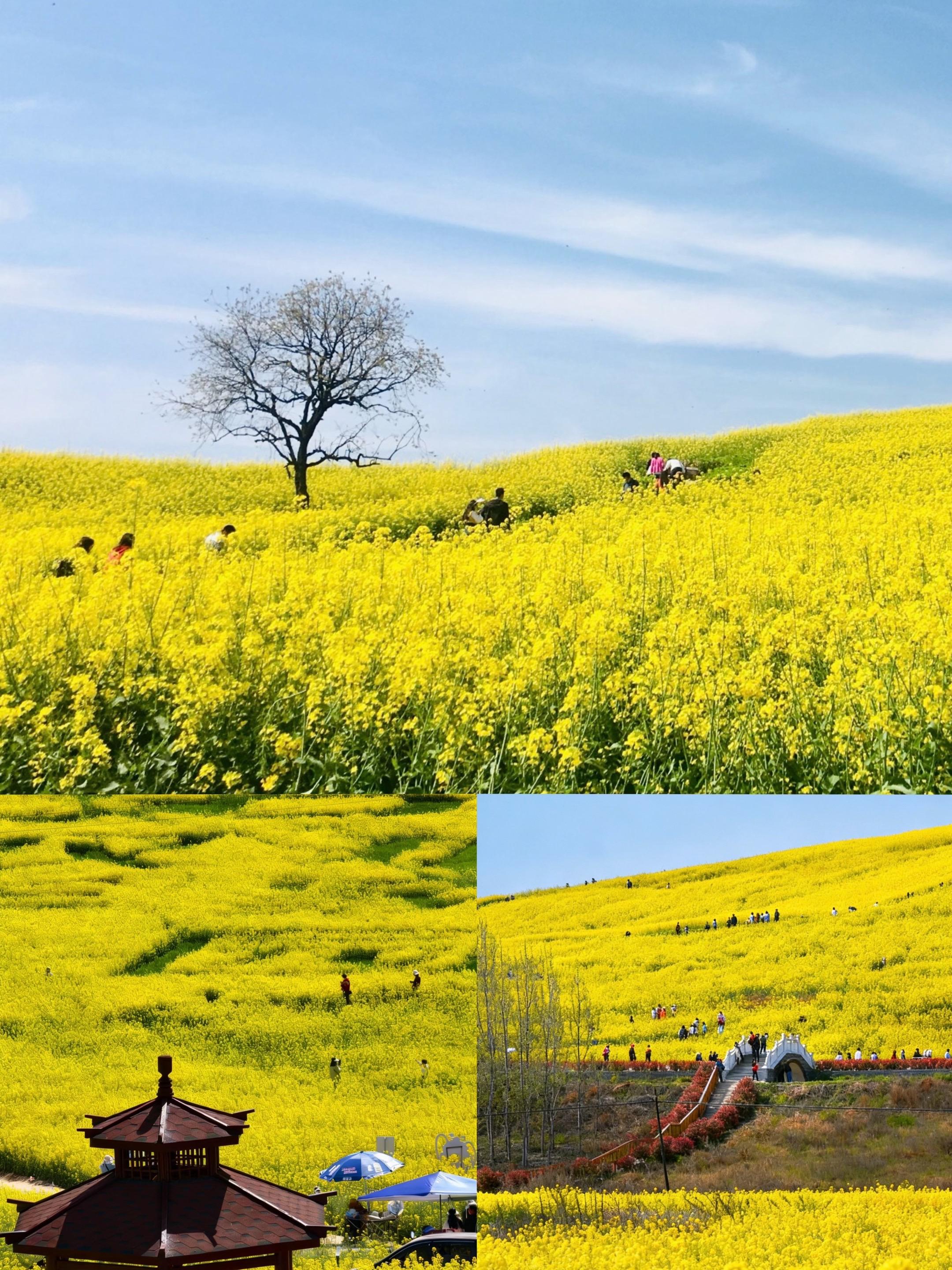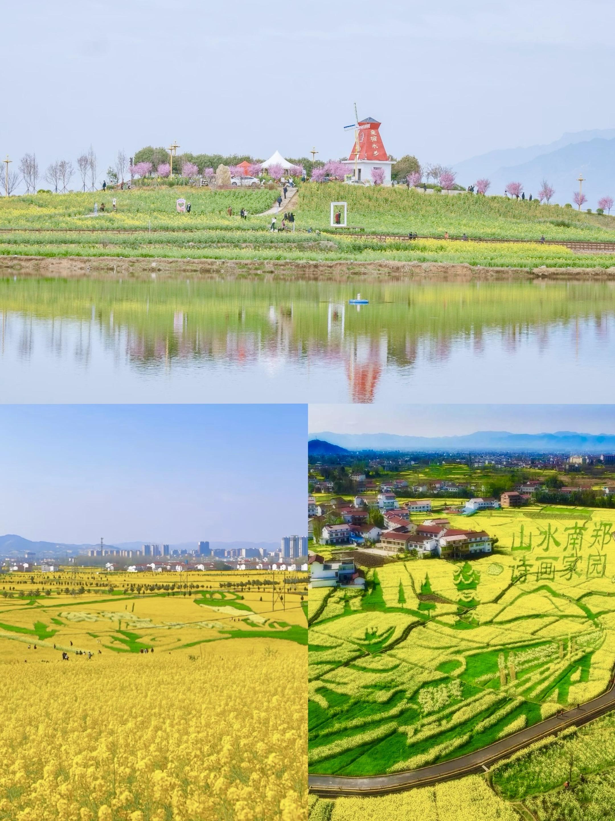 千亩连片金浪+彩色油菜花,搭配水乡田园与汉风演出,有小火车、市集、旅拍等配套,3月中下旬至4月上旬是盛花期。