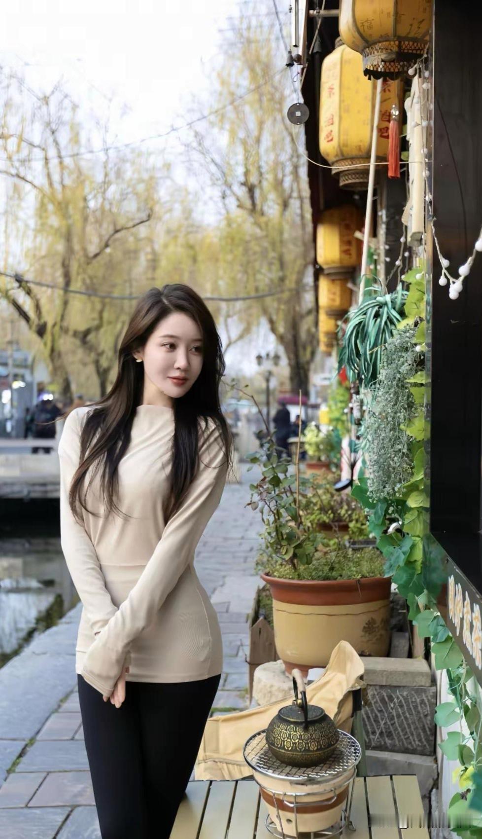 在古色古香的街道上,她俏皮地摆出可爱的姿势,仿佛在诉说着一个温暖的故事。
