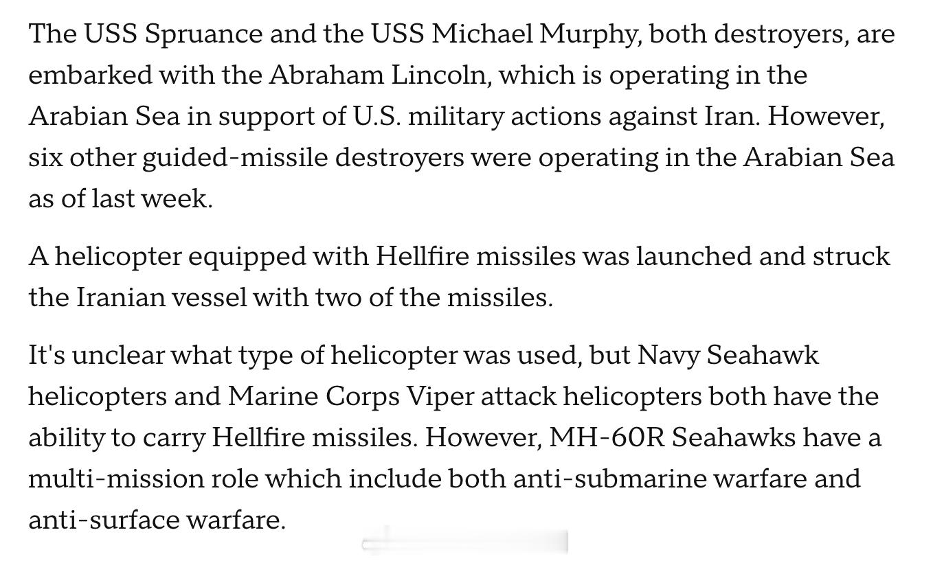 在一艘伊朗船只过于靠近正在阿拉伯海执行对伊朗作战任务的亚伯拉罕·林肯号航空母舰后,一艘美国海军舰艇试图使用安装在舰艏甲板上的 Mark-45舰炮向其开火,但多次射击均未命中。随后,一架配备 AGM-114 Hellfire(“地狱火”导弹) 的直升机升空,对该伊朗船发射了两枚导弹并成功命中。