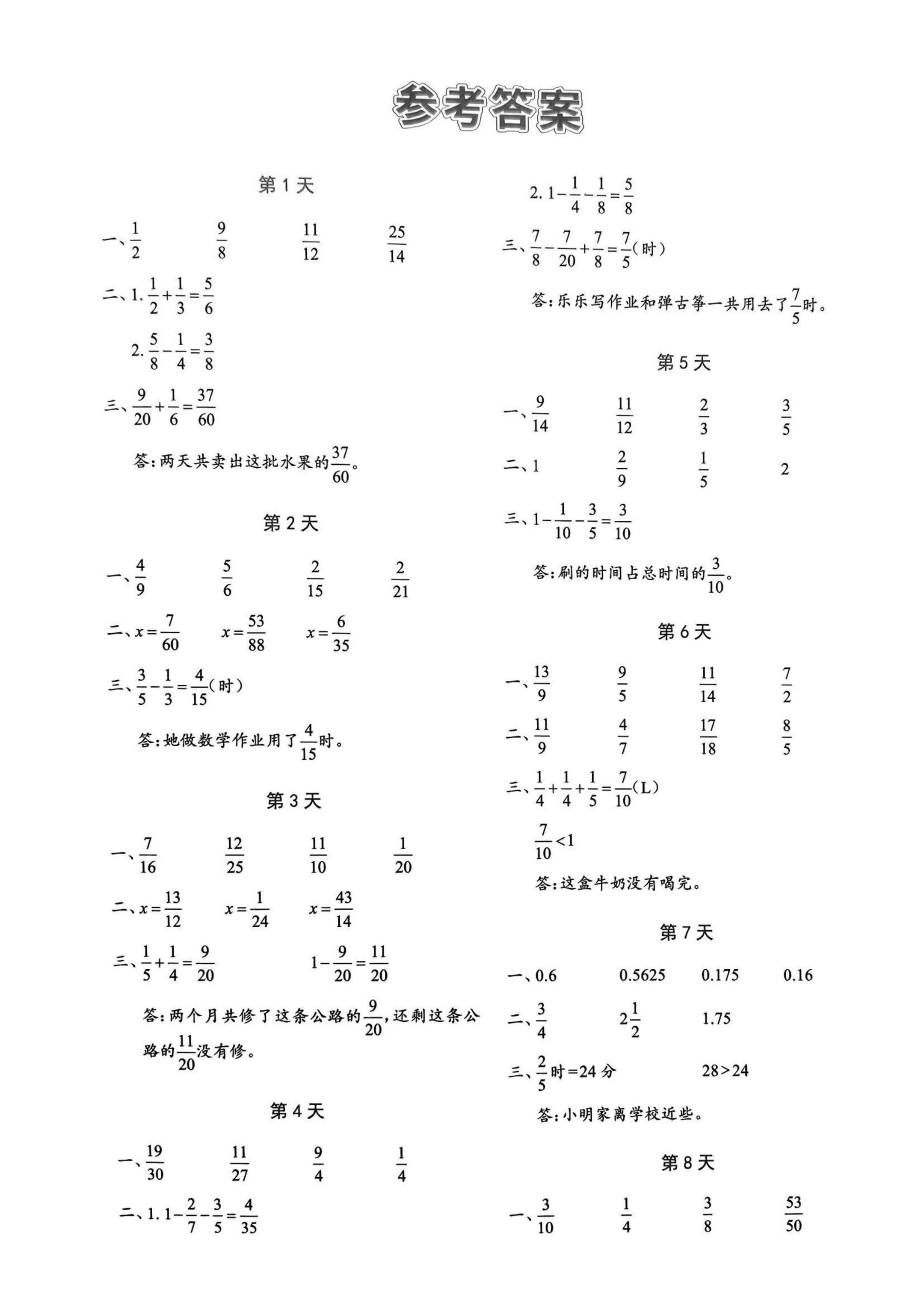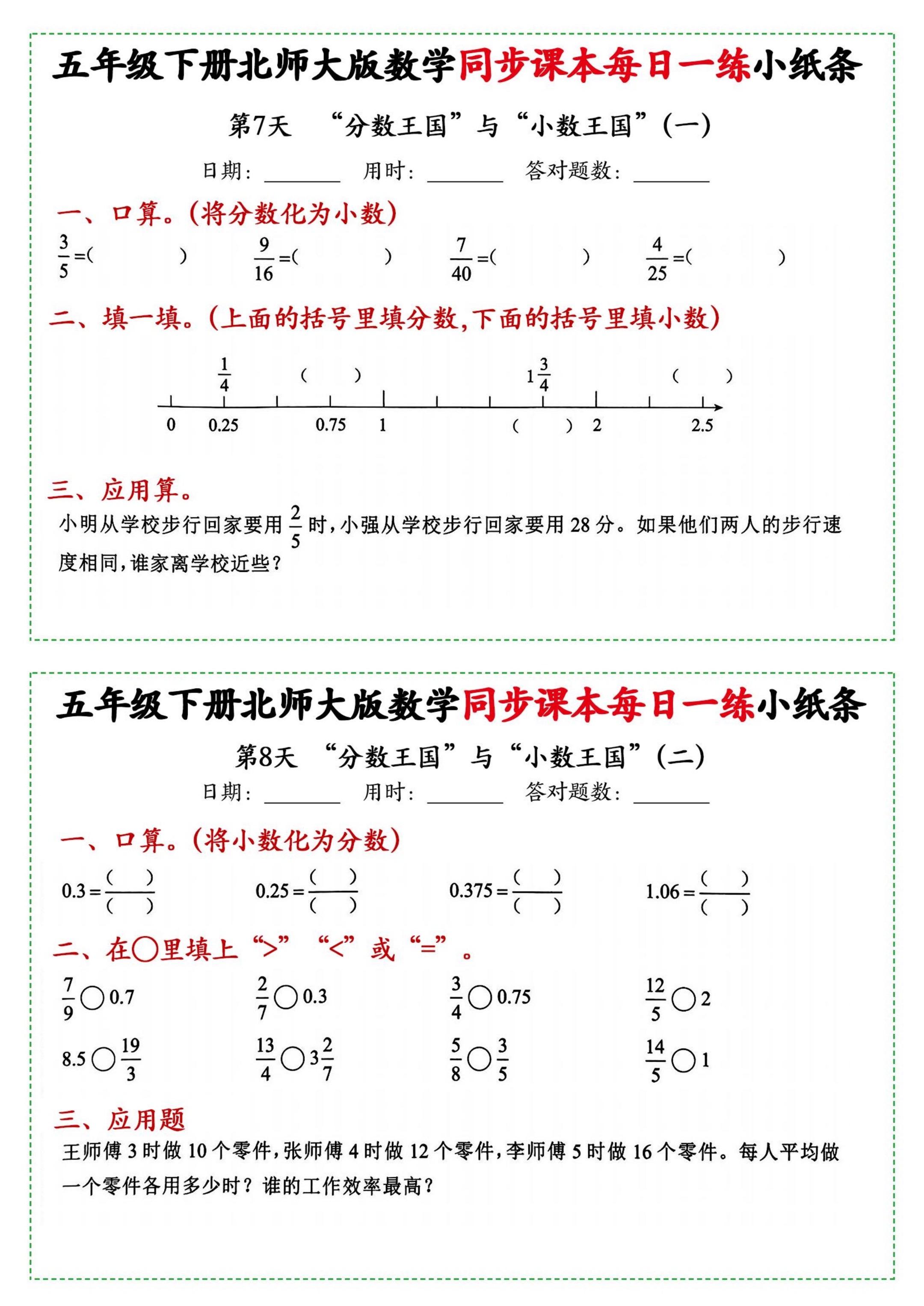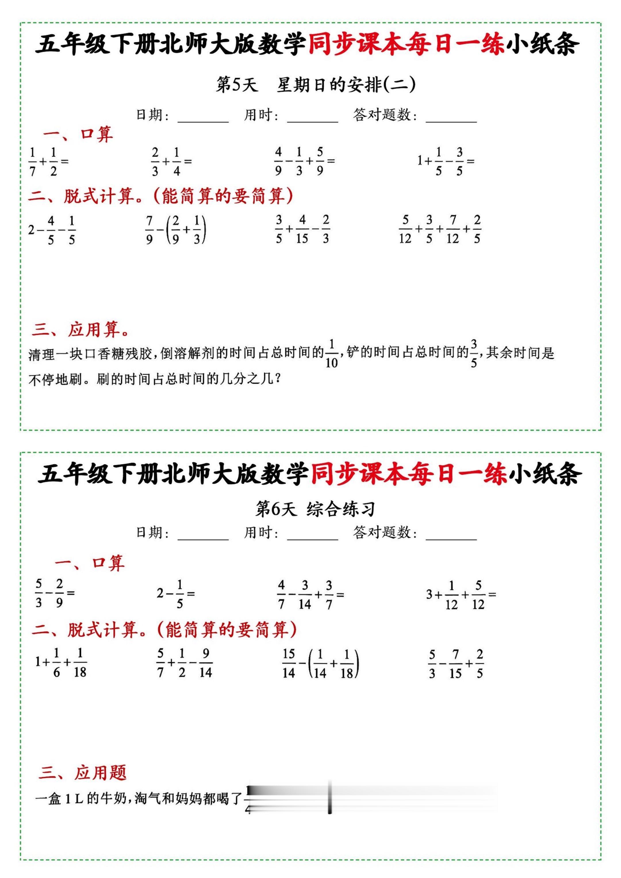 小学五年级下册数学北师大每日一练附带答案。 同步课本每日一练...