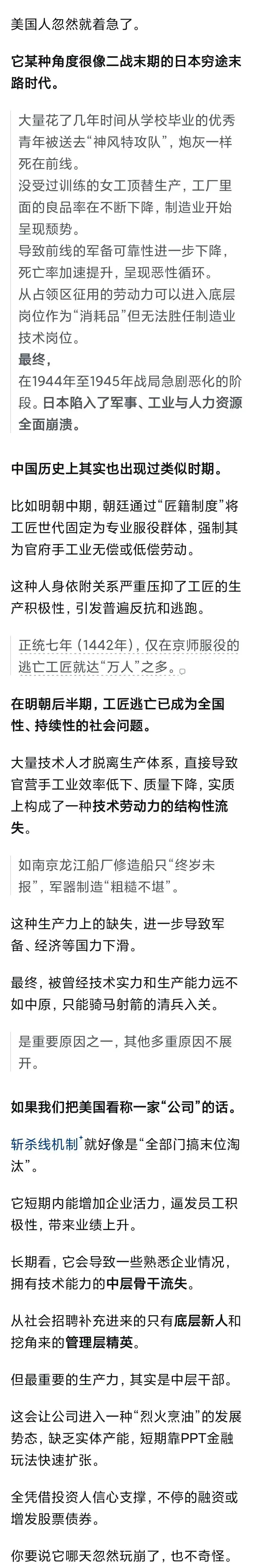 其实“斩杀线”对美国根本不是好事! F-22生产线关停才10个月,美国就后悔想重启,结果发现三分之一技工失联,有的转行、有的下落不明。隔一年再试,不少配套供应商直接没了,产业链彻底断了。 别看美国在高科技上吆喝得响,这下咱们可算是看清他们的“工业空心化”有多离谱了。当年不可一世的F22生产线,说关就关,等回过头想重开,发现那一半的核心工人早断了联系。 我听在那边混的朋友说,像马特这种能徒手在铝板上掐出毫米级曲线的高级钣金工,失业半年就得卖掉车库里的工具。医保一断,孩子生个病,人直接就被生活碾碎了。 这种手艺人一散,不仅仅是丢了几个岗位的活儿。等厂家想重启型号,发现上游做涂层的小厂早倒闭了,老板正蹲在超市收银呢。 甚至连B2的备件都没法正经生产,还得去博物馆或老飞机上拆零件搞“逆向工程”,说出来都嫌丢人。 其实这事儿挺讽刺的,很多专家吹嘘的市场修复能力,在现实面前就是个笑话。人毕竟不是螺丝钉,拔出来容易,再想拧回去,那螺纹早就崩坏了。 工业这东西,说到底还是靠那股子“人的默契”。那种哪怕机器偏了一丝,老师傅凭感觉就能校准的经验,才是最贵的护城河。一旦这根线绷断,整个体系就开始从内部烂掉。