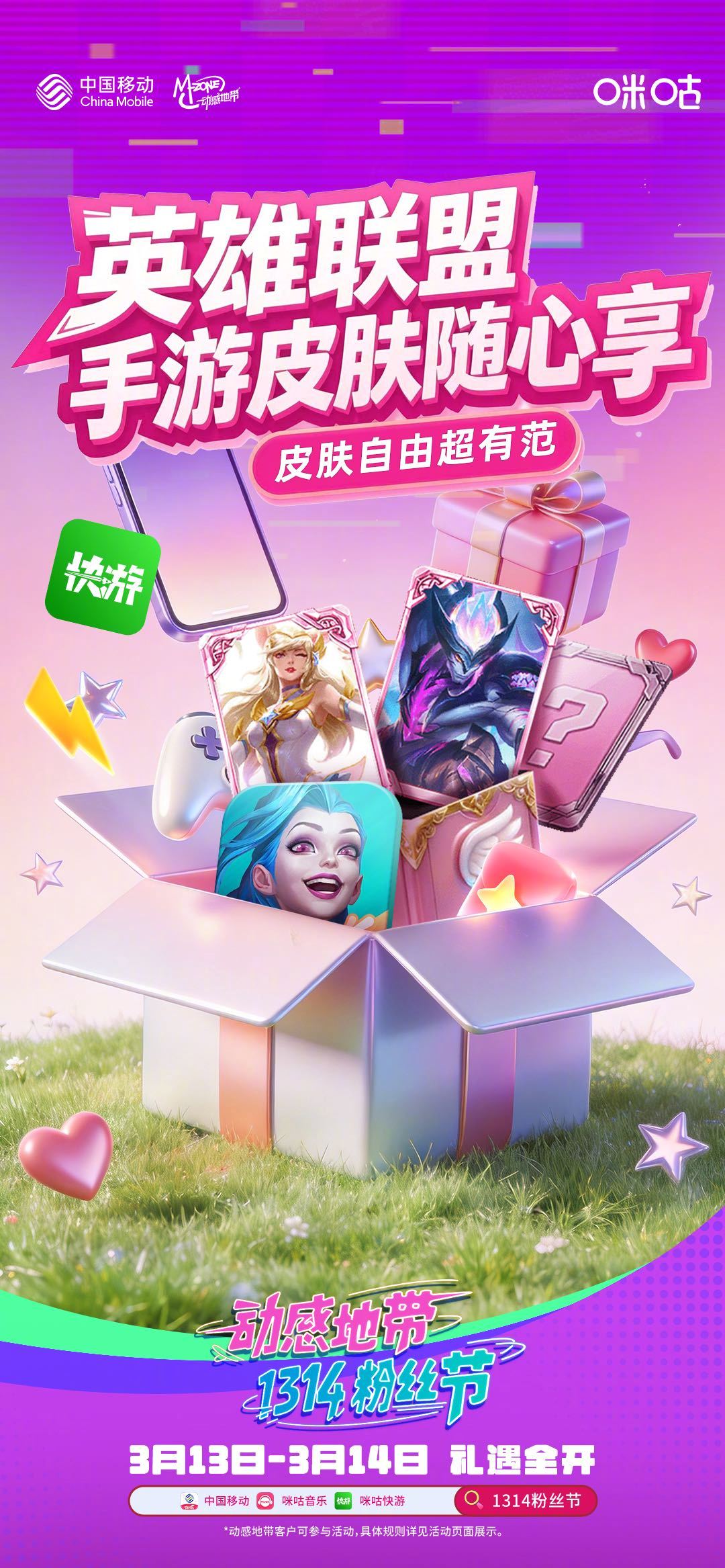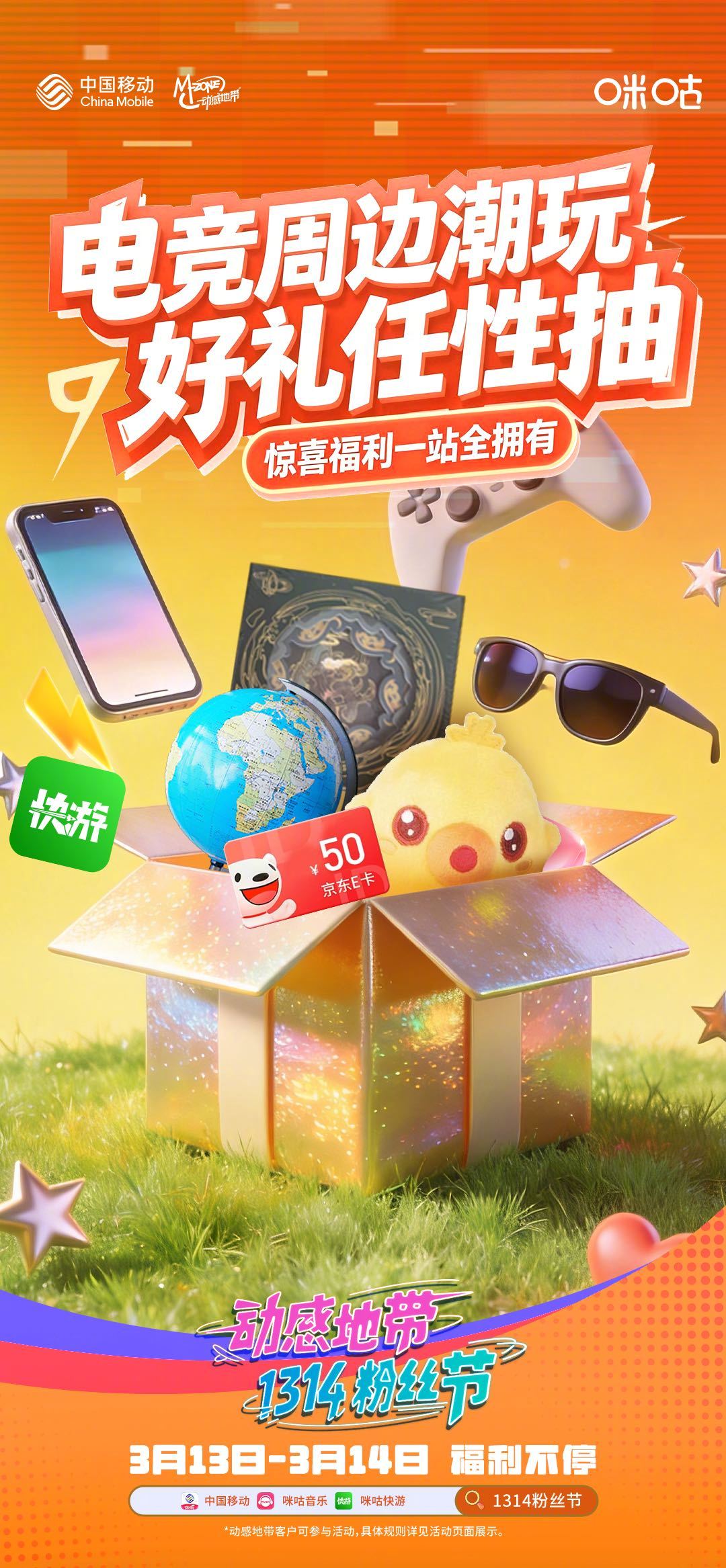 福利已就位,动感地带1314粉丝节惊喜上线!王者荣耀皮肤盲盒、英雄联盟手游皮肤、电竞潮玩周边悉数集结,宠粉好礼全就位~3月13-14日,上中国移动、咪咕音乐、咪咕快游 APP,打卡粉丝节解锁缤纷福利,畅快开玩!#电竞特权日# #1314粉丝节#速戳链接解锁动感地带用户专享权益:网页链接