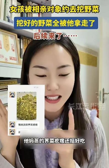 “笑不活了!”陕西,一女子被相亲对象约去挖野菜,最后两人挖了一兜荠菜,不料,男方临走时把整兜荠菜全拿走了!女子还以为对方做好美食后能分她一点,结果等了一天,对方只发过来一句“我妈蒸的荠菜疙瘩还挺好吃!”女子看后直接无语了!网友:男方凭实力单身! 女子是经人介绍认识的这个相亲对象,两人加了微信聊了几天,没觉得有啥反感,对方说话也挺实在,不像有些相亲男那样油腻。 聊了大概一周,男方主动约见面,没提吃饭看电影这些老套路,反而说春天野菜鲜,约她一起去挖荠菜,还说挖完了让他妈做美食,到时候一起尝尝。女子一听,觉得这人挺踏实,不搞虚的,接地气,就爽快答应了。 两人按约定碰了面,男方还特意带了两个小篮子,说是用来装挖好的荠菜。碰面后没多寒暄,就一起去了郊外的田埂上,那里长满了绿油油的荠菜,看着就新鲜。 女子本身也会挖野菜,男方也时不时指点两句,告诉她哪种是正宗的荠菜,怎么挖才不会弄坏根,两人一边挖一边有一搭没一搭地聊天,气氛还算融洽。 就这么蹲在田埂上挖了两个多小时,两人一共挖了满满一兜荠菜,看着亲手挖的成果,女子还挺有成就感,一直记着男方说的“一起尝美食”的话,心里琢磨着,就算不分生荠菜,等男方妈做好了,总能分她一点尝尝鲜。 可没想到,收工准备回家的时候,男方的操作直接让女子愣在了原地。他没跟女子商量一句,就伸手把两人一起挖的那兜荠菜,全倒进了自己的篮子里,然后拎着篮子就要走,全程没提分荠菜的事,也没再提做完美食一起尝的话。 女子当时有点懵,下意识问了一句,男方就笑着说,让他妈先做,做好了再跟她说,说完就转身走了,留下女子一个人站在原地,手里还攥着挖野菜的小铲子。 女子没好意思再多问,心里还安慰自己,可能男方就是比较直男,没多想,等做好了肯定会记得给她送点,或者至少会喊她一起吃。就这样,她空手回了家,整整等了一天,时不时就拿手机看看,生怕错过男方的消息,连饭都没好好吃,就盼着能尝到一口新鲜的荠菜美食。 等到傍晚,手机终于震动了,女子赶紧点开,以为是男方要送美食过来,或者喊她过去吃,结果屏幕上就只有一句话:“我妈蒸的荠菜疙瘩还挺好吃!”没有道歉,没有邀请,甚至没有一句关心她累不累的话,仿佛挖野菜的时候,女子根本就没在场,那些荠菜全是他自己挖的一样。 女子看着这条消息,瞬间就无语了,气也不是,笑也不是。她在意的从来不是那兜荠菜,毕竟荠菜值不了几个钱,她在意的是男方的态度——约她出来一起付出,最后却独自占有成果。 还特意发来炫耀,完全没把她的付出放在眼里。无奈之下,女子把自己的经历和那条消息的截图发到了网上,吐槽这段奇葩的相亲经历。 帖子一发出来,很快就火了,网友们看完纷纷调侃,清一色评论“男方凭实力单身”。有人说,这男生情商简直为零,就算不想处对象,也不能这么离谱,辛苦人家女生陪你挖一下午,连一根荠菜都不分,还发来炫耀,太没礼貌了。 还有网友分享自己的类似经历,说自己曾经跟相亲对象爬山,对方摘了一袋子野果子,全程自己吃,一个都没给她,从那以后就再也没联系过。 其实这事说大不大,说小不小,核心从来不是荠菜本身,而是细节里藏着的人品和分寸感。相亲的本质,是两个陌生人互相了解、双向奔赴,不管是挖野菜还是吃饭逛街。 重点都是互相尊重,懂得分享。男方的做法,看似是小事,却暴露了骨子里的自我——凡事只考虑自己,把别人的付出当作理所当然,没有一点共情力和边界感。 对比那些懂得尊重人的相亲对象,哪怕只是一起喝杯奶茶,都会记得对方的口味,一起做件小事,都会想着分享成果,而这位男方,却连最基本的人情世故都不懂。 有人说他是老实,可老实不等于自私,真诚也不是自我中心。说白了,这不是情商低,而是没把对方放在心上,这样的人,就算再踏实,也很难经营好一段感情。 不过换个角度想,对女子来说,这未必是件坏事。一场挖野菜的经历,就看清了对方的为人,相当于一次低成本的筛选,及时避开了三观不合的人,总比相处很久后,才发现对方极度自我要幸运得多。