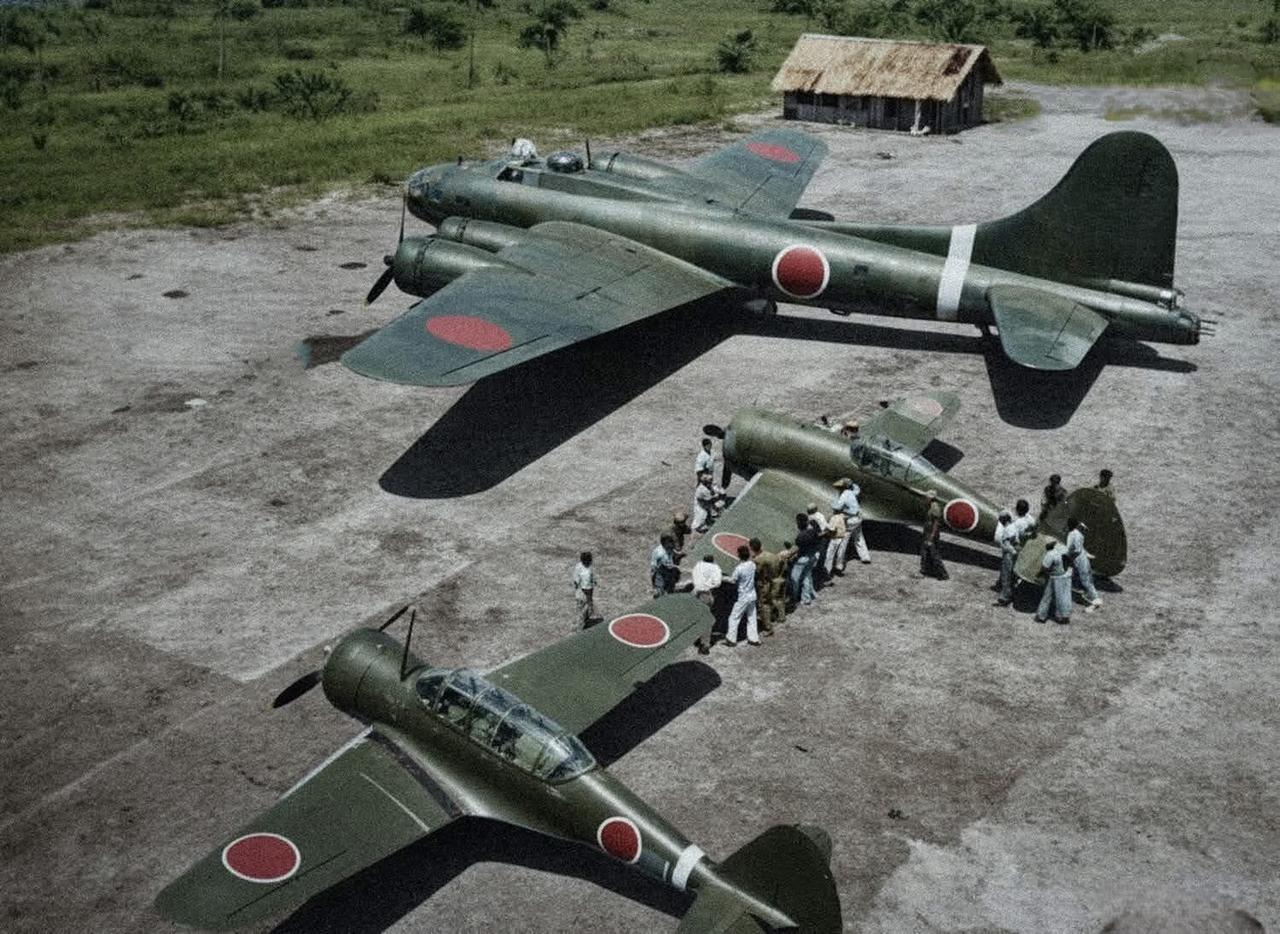 这是一张摄于1943年左右的彩色照片,照片内容是一架被缴获的美国B-17轰炸机和一架CW-21/22型飞机,拍摄于爪哇岛,机身涂有日军涂装。显然,这些飞机在试飞和技术评估后就被拆解了