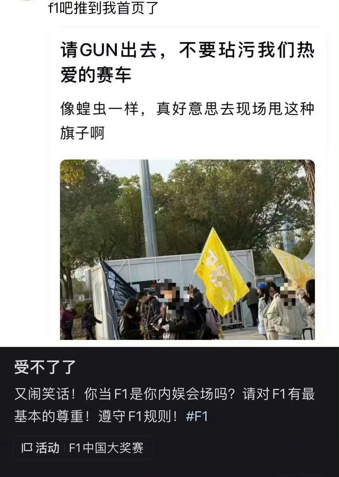 田栩宁F1活动田栩宁粉丝就举旗子捣乱怎么了 f1