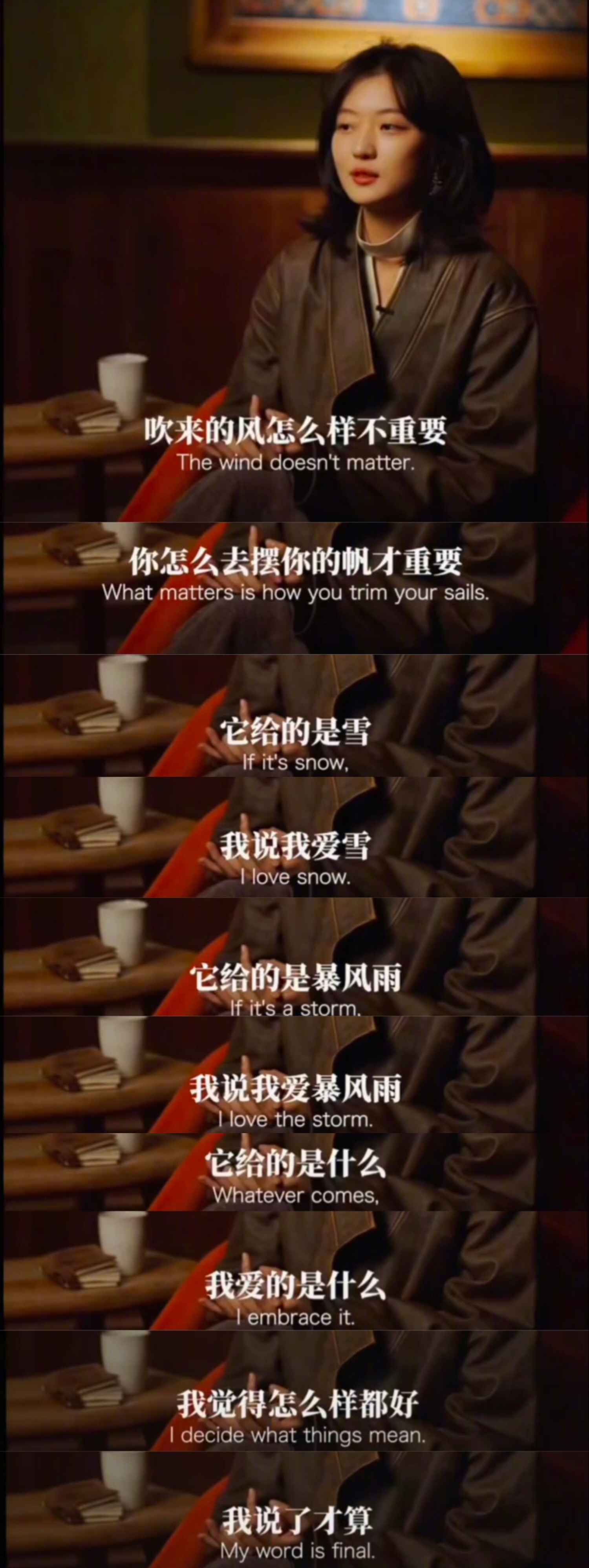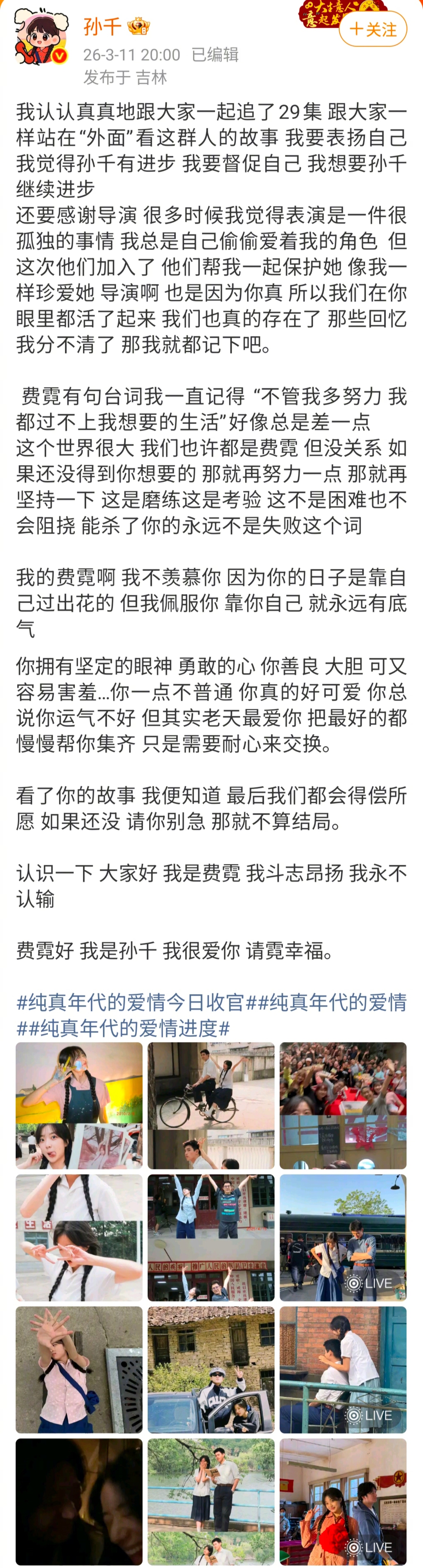 孙千最让人着迷的一直都是温柔的外表下拥有坚定且强大的内核!在《纯真年代的爱情》中,把妈妈辈那股独有的倔强和韧劲演的淋漓尽致。而在告别费霓的时候,共情角色的同时也坦荡大方地肯定自己,她在文字中写到“我要表扬自己 我觉得孙千有进步”,完全能感受到这短短的几个字背后是孙千独属于自己的底气和松弛感…但是我们孙千在表扬自己的过程中也不忘push自己,直言“我想要孙千继续进步”,就这样不内耗不焦虑的同时,事业心野心也大大的🈶!啊啊啊啊完全能感受到此女的人格魅力啊🥹