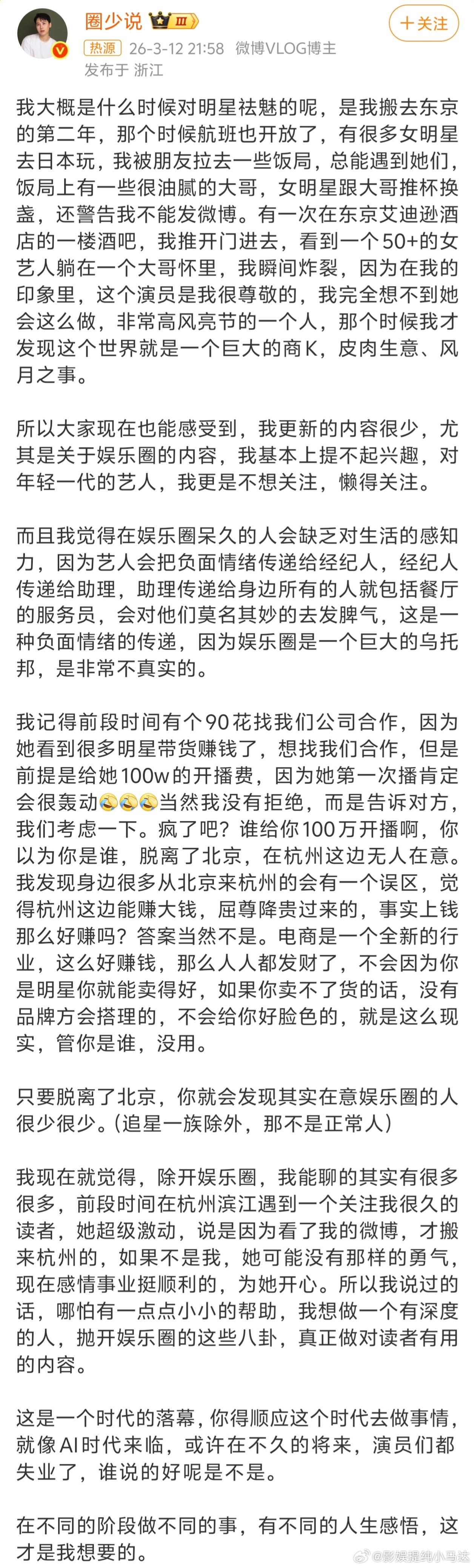 曝50多岁女艺人躺大哥怀里看完后只感觉这人本质也是个狗仔,也是在给自己赚噱头。你不想融进一个圈子可以,直接远离就好了,干嘛拿别人的事儿说。这和特么的在饭桌上给人偷摸摸录音拍视频有啥区别?另外作为一名艺人狮子大开口也可以理解,但也没有必要把这事儿拿来说给那名女艺人造成一定私人影响。我给的建议吧,就是圈内人能远离这种人就远离。交不了心一点的那种