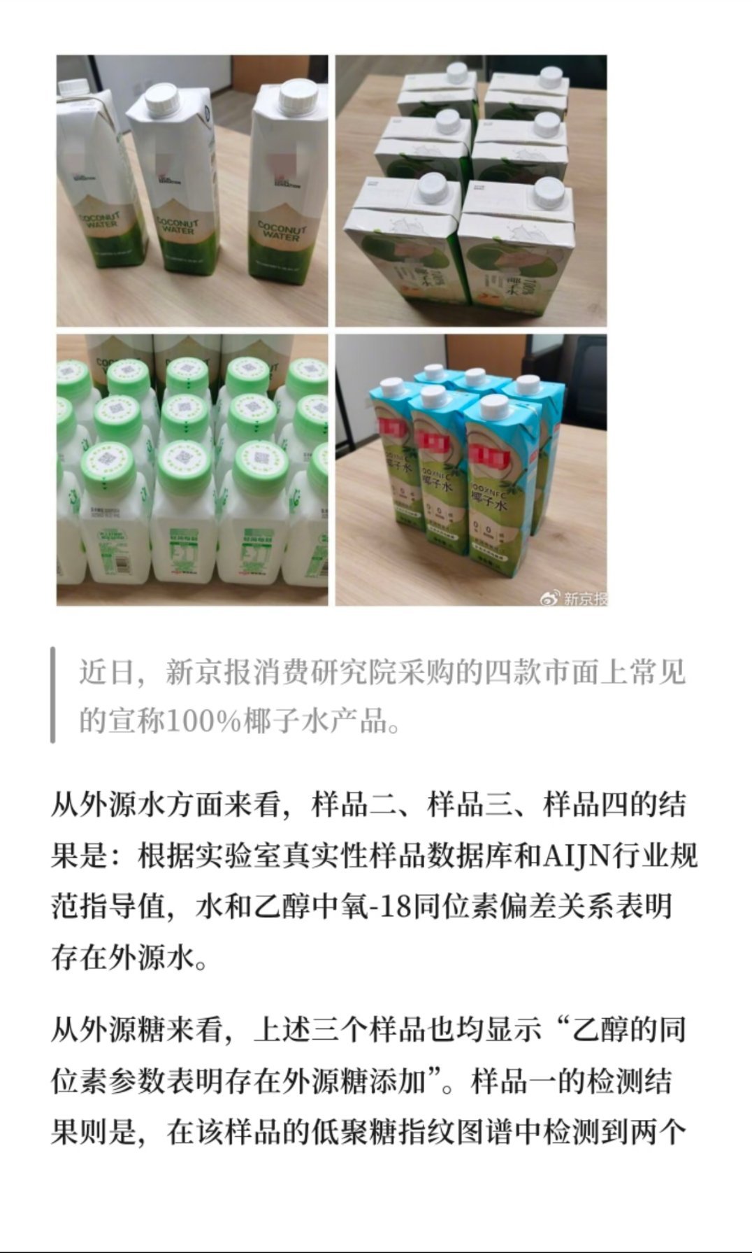 多款100%椰子水被曝兑水加糖别搞,我平时还是挺喜欢喝椰子水的。如果按照这个调查结果显示,四个样品均有外源糖添加,三个存在外源水,但几个品牌都否认了加水加糖~