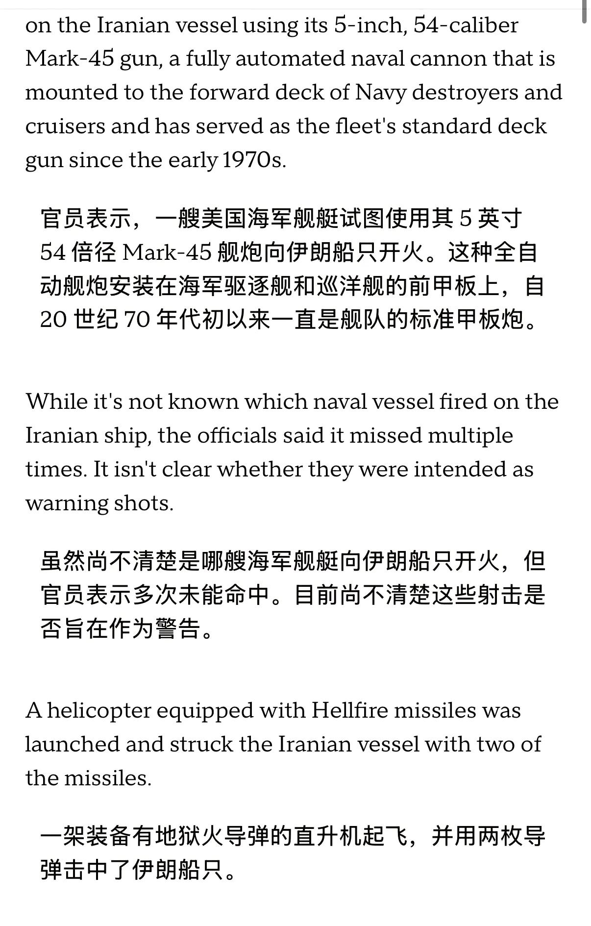 现在能够确知的是“林肯”号航母又一次遭到伊朗袭击了。而且从美国哥伦比亚广播公司(CBS)的报道来看,这次伊朗小艇竟然突破了“林肯”号航母编队的外层和中层防御圈,直接切入内层防御圈。美军护航舰艇用127毫米舰炮射击,竟然一直打不中,这射术也是够烂的。最后还是紧急起飞一架舰载直升机,发射2枚“海尔法”导弹才击中伊朗小艇。 从伊朗的公开报道看,这是第三次对“林肯”号进行袭击。