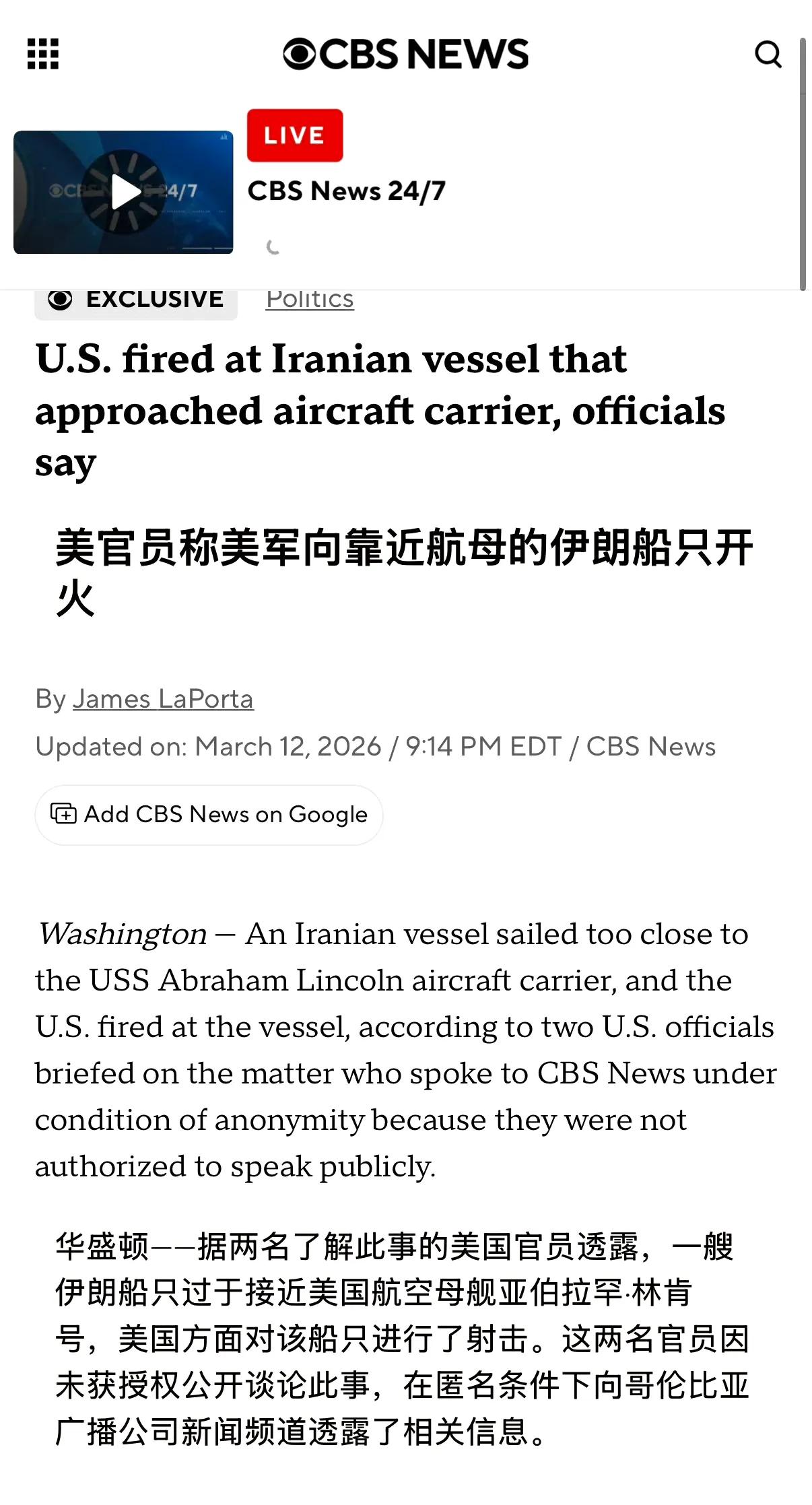 现在能够确知的是“林肯”号航母又一次遭到伊朗袭击了。而且从美国哥伦比亚广播公司(