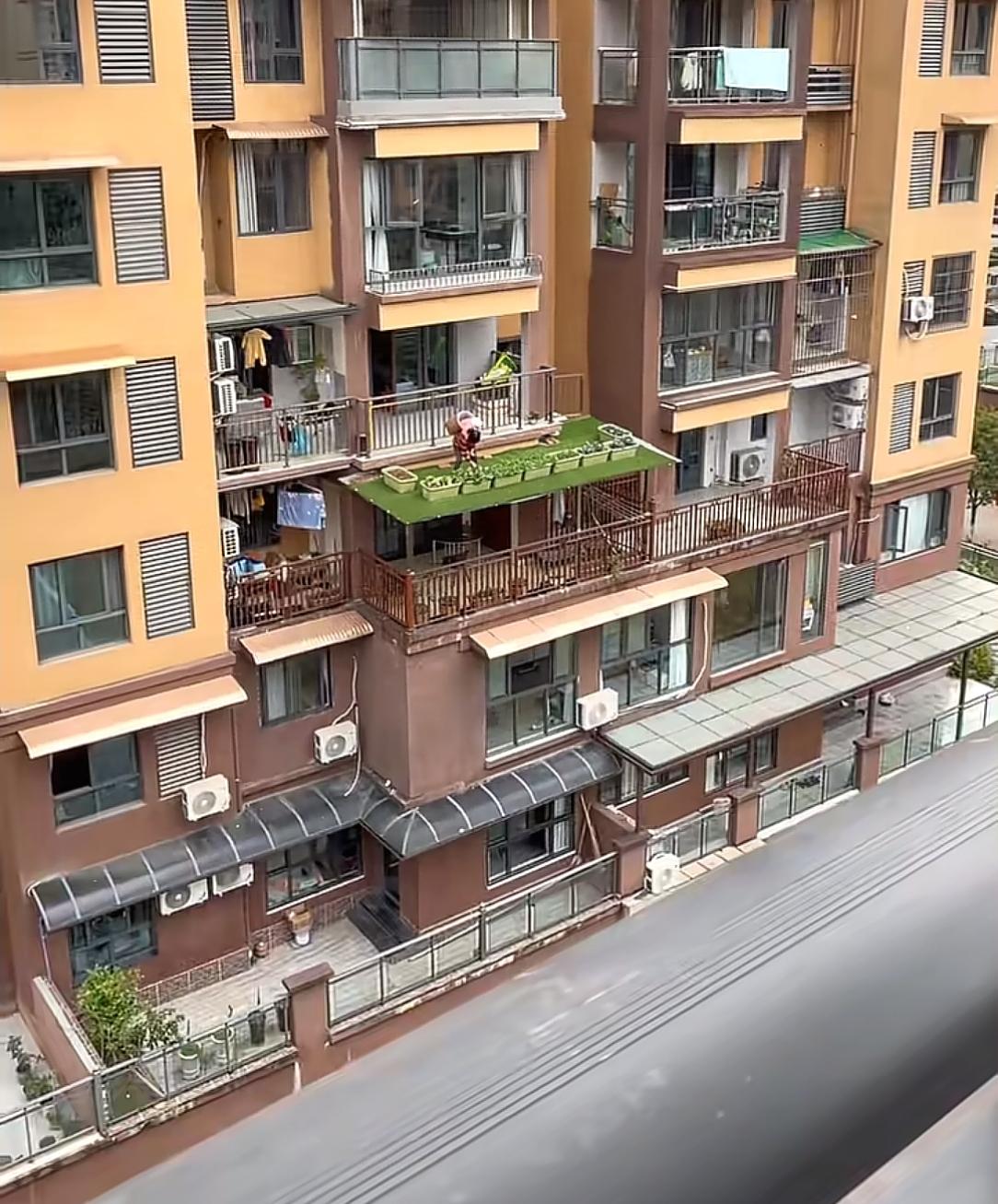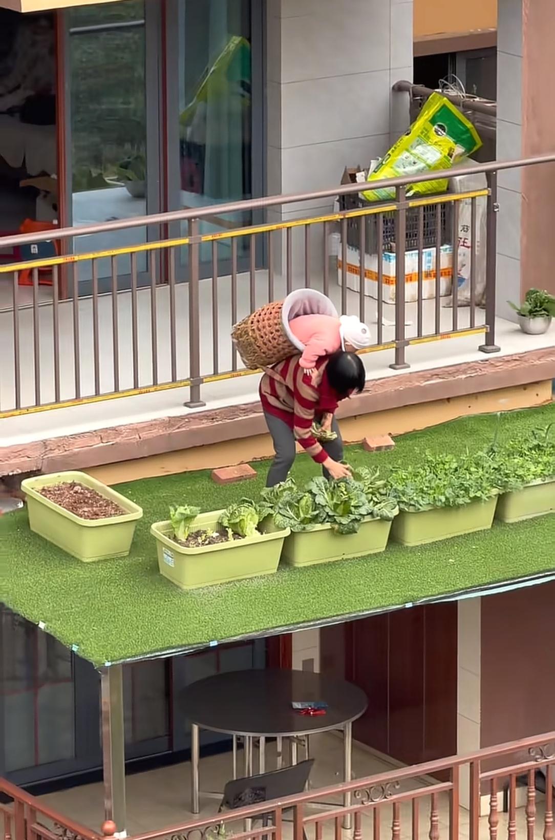 老辈子都这么狠的吗? 重庆阿婆背着孩子在3楼简易棚上弯腰摘菜,阿婆弯腰摘菜时,孩子在背篓里摇摇欲坠,仿佛下一秒就能从背篓里里掉下来!这一幕看得实在让人揪心! 仔细看,这个顶棚是人家三口在阳台上做的顶棚,而在四口的阿婆却把这棚子当成了种菜的地方,在上面用泡沫箱种了不少菜,大妈就这样背着孩子家里的阳台护栏上跨了出来,而这顶棚也没有任何护栏。 阿婆每次弯腰摘菜时,背篓里的孩子也会随着往下坠,而且还是头朝下,随时都有可能掉出来,仔细看,这孩子也是求生欲满满,每次都紧紧撑着阿婆的肩膀。 试想一下,不管是摘菜时棚子塌了还是孩子从背篓里掉出来,都挺让人难受的,万一出事后果真是不堪设想! 好在,已经通知了阿婆家里的年轻人,估计孩子的父母也不敢再让阿婆带孩子了吧,一点安全意识都没有,实在是太吓人了! 话说,楼下这家知道后应该也会流冷汗吧,这棚子实在是留不得啊,出事了楼下也会跟着倒霉。 最后,对于这事你怎么看?大家可以评论区说说自己的看法~