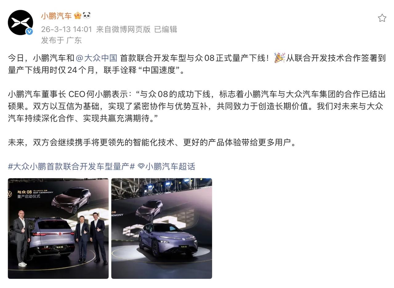 最近小鹏汽车确实好消息不断,二代VLA持续给新车新上,就连和大众合作的新车也同时有消息了,先说结论,“ 小鹏汽车和@大众中国 首款联合开发车型与众08正式量产下线”,从联合开发技术合作签署到量产下线用时仅24个月,这是又来诠释什么叫做中国速度。 当然也给老外瞧一瞧,中国汽车技术的高快快稳。 然后来点官话,小鹏汽车董事长 CEO何小鹏表示:“与众08的成功下线,标志着小鹏汽车与大众汽车集团的合作已结出硕果。双方以互信为基础,实现了紧密协作与优势互补,共同致力于创造长期价值。我们对未来与大众汽车持续深化合作、实现共赢充满期待。” 给大家上一点与众08的官图,来感受一下这款新车。 和在与众08项目中,小鹏汽车主要负责智能化相关技术: • 智能驾驶:提供VLA全场景智驾系统,搭载双图灵芯片(1500TOPS算力),实现增强版L2(L2++) 辅助驾驶,支持车位到车位全场景覆盖。 • 电子电气架构:与大众联合开发CEA本土区域控制电子电气架构,为整车智能化提供底层支撑。 • 智能座舱:提供AI智能助手、车机交互、OTA升级等软件与芯片技术支持。 总而言之一句话大众汽车负责的是整车的底盘、质量、生产,小鹏汽车就是负责智能驾驶的大脑了。 目前对于与众08 这款车型最特别的肯定就是来自于前面,非常大胆的分体式灯组,加上细长的贯穿灯带,VW标克发光,并且支持迎宾灯语;车身尺寸5000/1954/1688mm,轴距3030mm;溜背姿态、无框车门、隐藏式电吸门把手;21英寸密辐/五辐轮毂可选,整体来说外观透着传统大众的影子,但又有科技质感的创新吧~【来自懂车帝车友圈】
