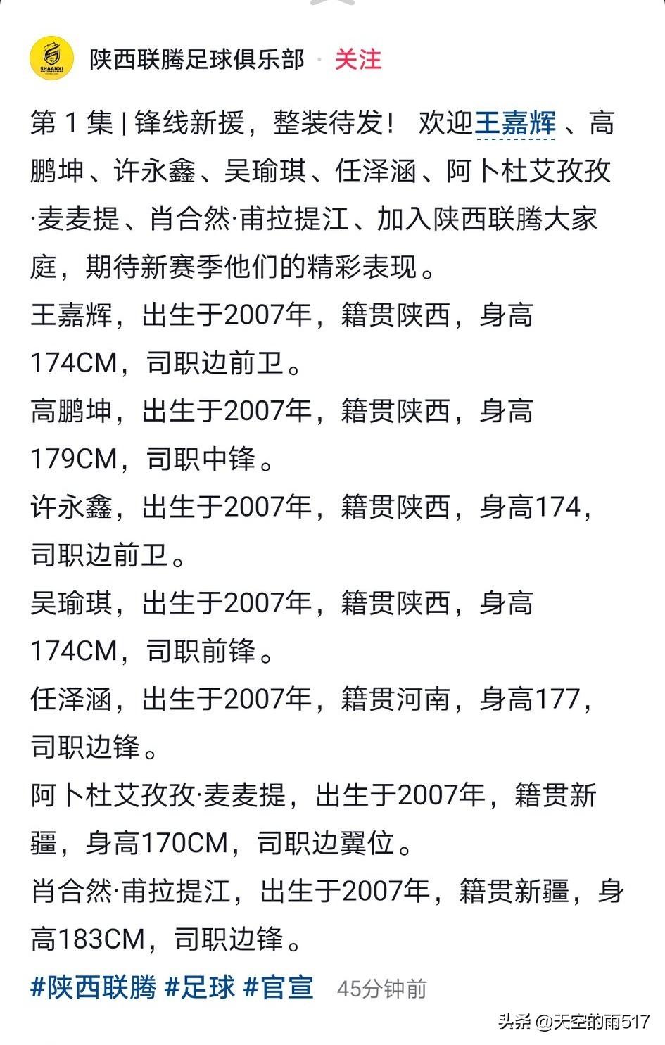 今天下午,陕西联腾俱乐部正式公布了今年新引进球员的名单。 陕西联腾是在去年陕西全运会U18阵容基础上组建的一支全新球队,目标是冲击乙级联赛。有消息称,该俱乐部还承接了今年中冠联赛的赛区。期待这支新的陕西球队,能为陕西足球带来百花齐放的景象。