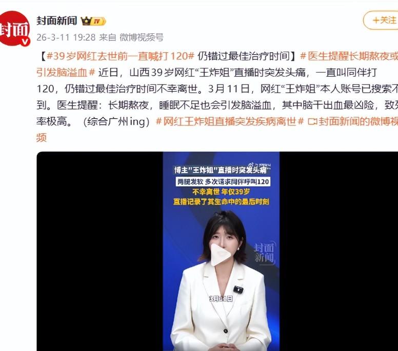 网红王炸姐离世,直播的时候喊打120,家中还有5岁女儿 熬夜身体亏欠的很,又讲那么多话,出问题的关键! 现今赚钱紧要,可身体才是奋斗的本钱,性命都没了赚再多又有何用。凡事必有代价,别用身体做赌注。 年轻人啊不要太拼了,请你们要珍惜生命,有吃有喝就够了,自己走了,留下的孩子是最可怜的……