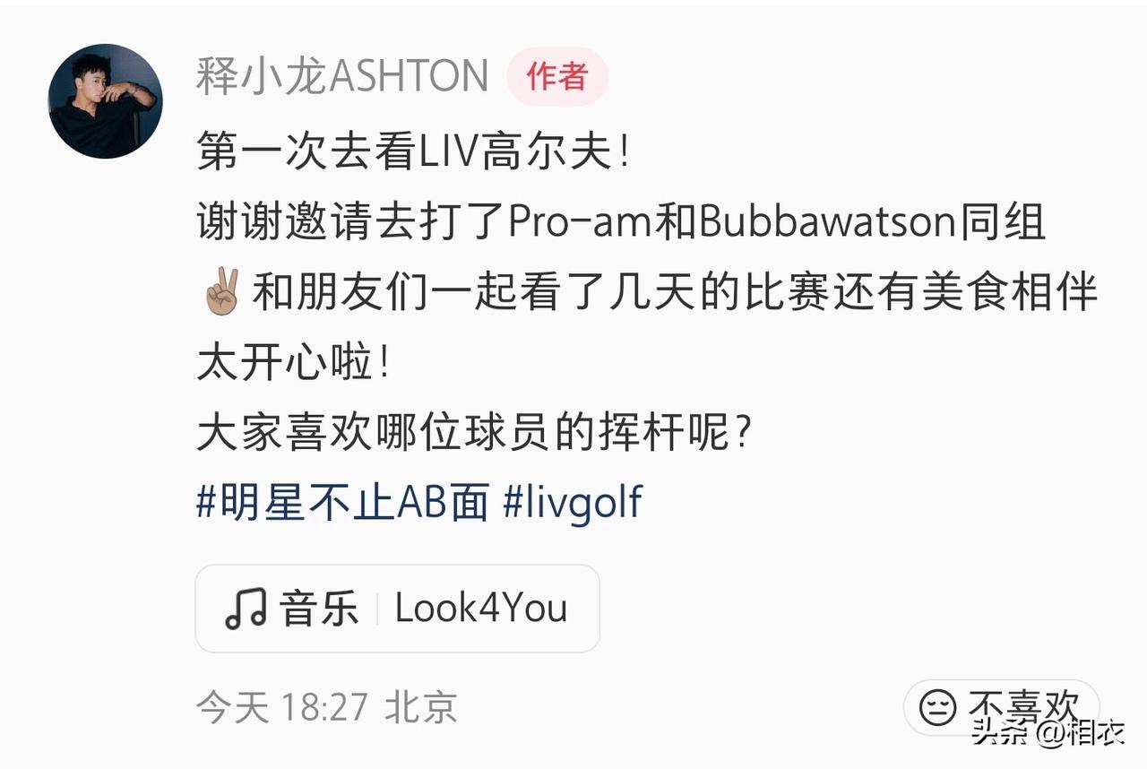 释小龙现身LIV高尔夫赛, 打Pro - am同组大牌还和好友逛吃,38岁的他活成了多少人羡慕的样子 他小时候演过《旋风小子》里那个很能打的小和尚,是特别有名的童星,现在很多人还记得他,可惜长大后就不怎么拍戏了,当然了,人家也不缺钱,只是偶尔拍一拍戏。 这次比赛,他先是受邀打了职业业余配对赛,还和美国高尔夫名将巴巴·沃森分在了一组,这种跨界的组合让人挺意外的,在球场上,他穿着运动服,戴着帽子和墨镜,挥杆打球的样子很认真,也很享受。 不只是打球,他还和朋友们一起看了好几天比赛,边看边吃各种好吃的,从网上发的视频和合照能看到,他和朋友都挂着比赛的证件,在看台前高兴地拍照,还和一个龙形的装饰物互动,整个人显得特别轻松自在。 他从小是功夫童星,在镜头前长大,但现在并没有被以前的名气困住,反而去打高尔夫,和朋友到处逛吃,把生活过得这么舒服自在,这种想做什么就去做,不被身份绑住的样子,不就是很多人心里特别想要的那种生活吗。