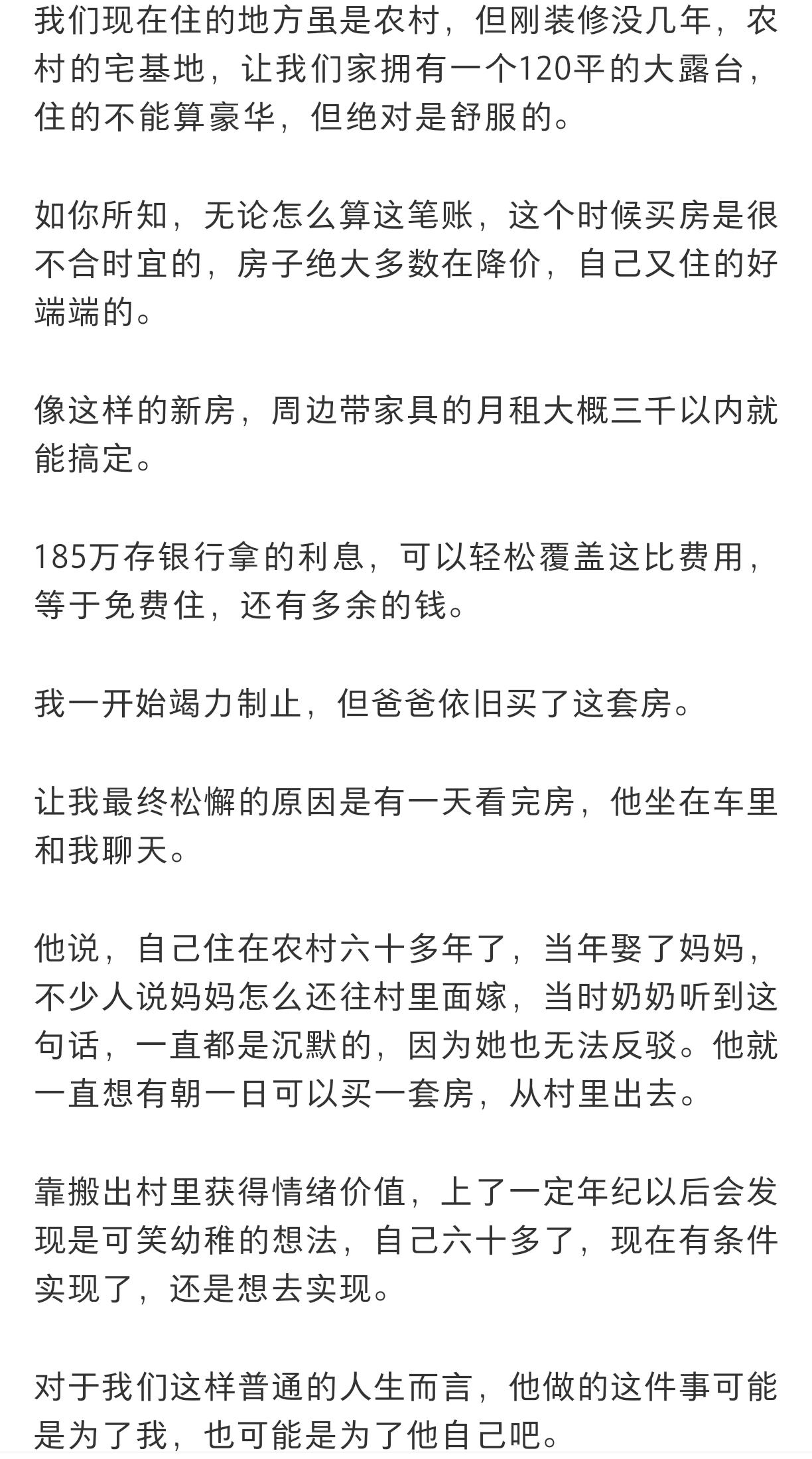 父亲为孩子185万全款购置151平米房子,是父亲冲动了吗?较之几年前,房价泡沫已经破灭很多了,那现在买会亏吗? 从纯经济理性看,这个时点全款买安置房,确实不算最优选择: 当下房价仍在下行周期,流动性弱,安置房涨幅远不如商品住宅,甚至可能继续阴跌; 185万存银行/理财,利息足以覆盖周边3000元月租,等于“免费住+还剩钱”; 自家农村宅基地住得舒服,并无刚需居住压力。 但从情感与人生执念看,他一点都不“冲动”! 他在农村住了60多年,当年母亲嫁进村时被人议论,这是他半辈子的心结——想“从村里走出去”,给家族换个身份; 60多岁的年纪,钱对他而言更多是“实现遗憾的工具”,他要的不是资产增值,是完成自我证明、给孩子留一份底气; 房本写孩子的名字,本质是把半生积累的安全感,以最实在的方式交到孩子手里。 所以,经济上看似“不划算”,情感上却是他能给的最厚重的爱,谈不上冲动,是执念的落地。  现在买会亏吗?——分两种视角看 第一,纯投资视角:大概率是“亏”的 安置房交易限制多、税费高,未来想卖很难找到接盘侠,资产流动性太差, 房价泡沫未完全出清,安置房本身品质、流通性都弱于商品房,长期保值难度大,甚至可能缩水; 185万全款投入,失去了其他理财/创业的可能性,利息损失也是隐性亏损。 第二,情感角度看,未必是“亏” 无论房价涨跌,孩子手里多了一套无贷资产,未来结婚、抗风险都多了一层保障; 父亲了却了“走出农村”的心愿,晚年心态会更平和,这份情绪价值无法用金钱衡量; 151平的大房子,自住舒适,若未来孩子愿意去住,能提升生活品质,这是“消费型幸福”。   尊重父亲的选择,这是他用一辈子攒下的钱,去圆一个60年的梦,比“赚不赚钱”更重要; 孩子也应该接住这份爱,但保持清醒——明白这套房的核心价值是“情感与兜底”,不要指望它成为投资工具,未来也不必因为房价波动而焦虑。 说到底,有些账,从来都不是用计算器算的,是用心算的。 未来买房趋势 买房价位 四五十万买房 农村孩子买房 1500w买房 安置套房 未来孩子买房