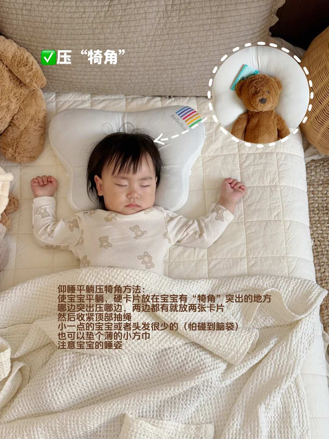 ✅扁头调整:仰睡减少,侧睡为主,左右交替避免睡偏头