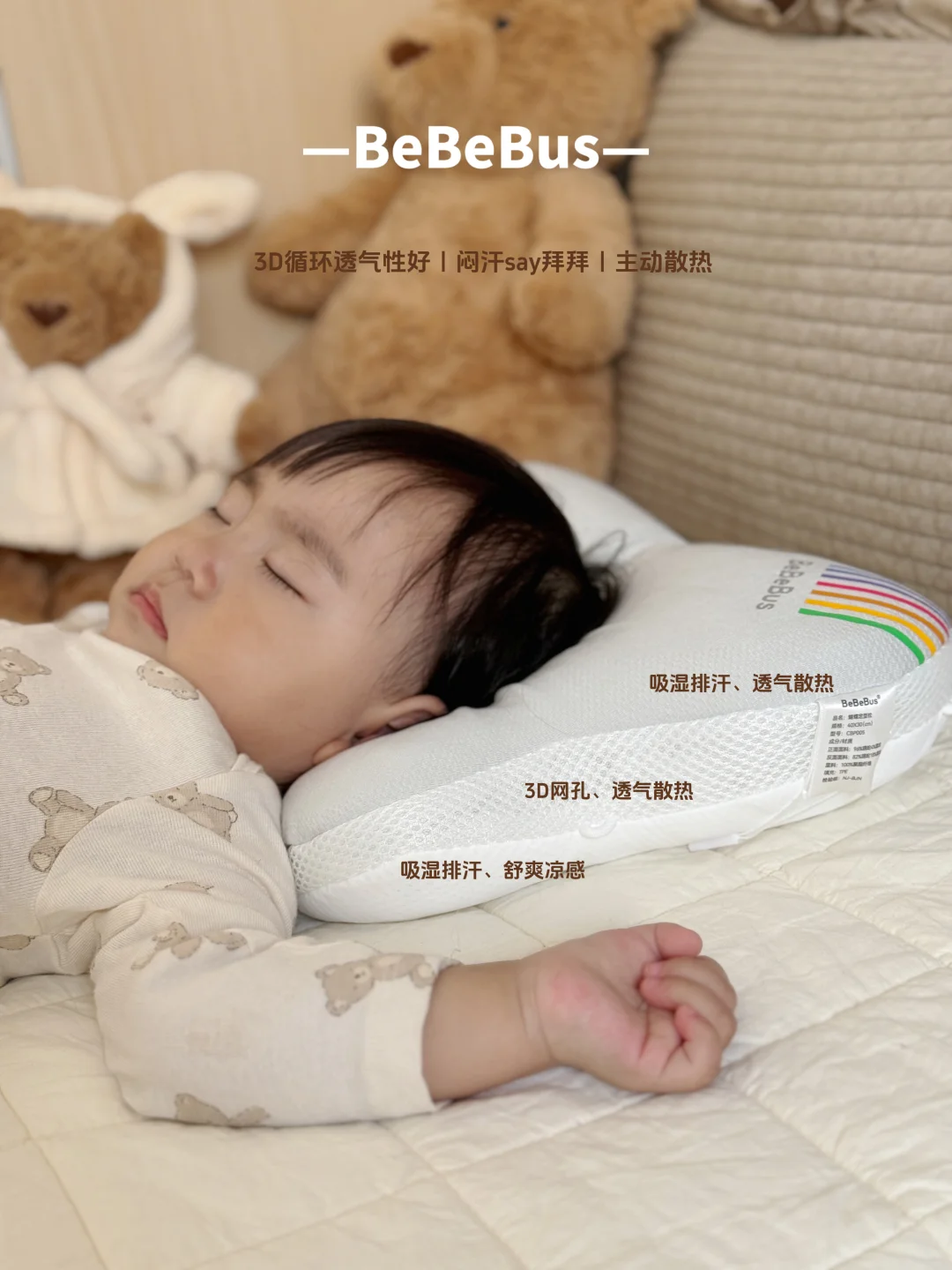 3D透气网孔,宝宝睡夏天也不会闷汗,更重要的是小月龄宝宝不会自主翻身,还可以防窒息,妈妈超安心,亲肤柔软的面料,双面设计冬暖夏凉!不愧是得到儿保认证的定型枕!