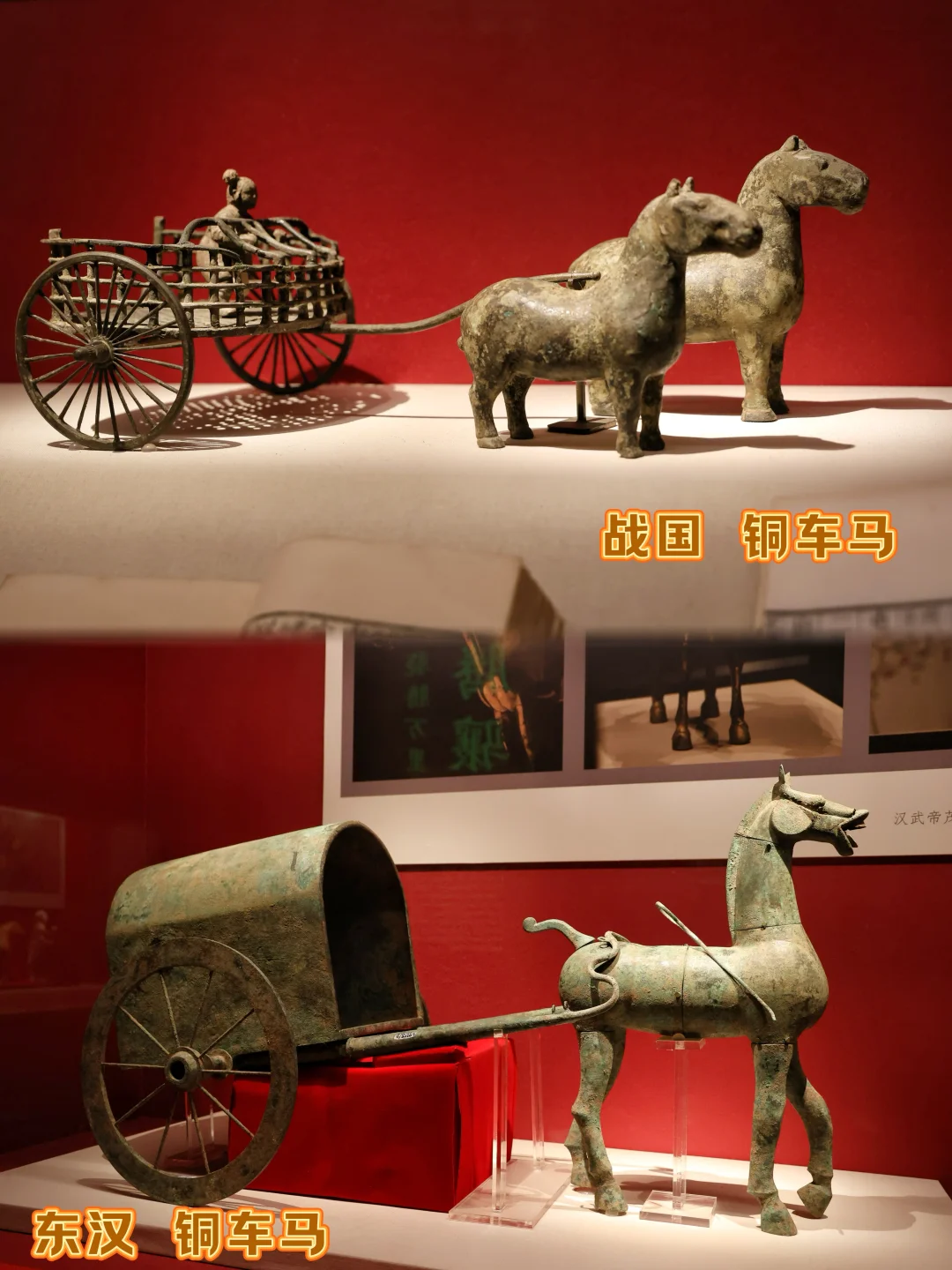 🐴东汉铜车马/陶马:东汉陶马昂首扬蹄,肌肉线条遒劲;带篷铜车马则是汉代出行礼仪的缩影,古朴又灵动。