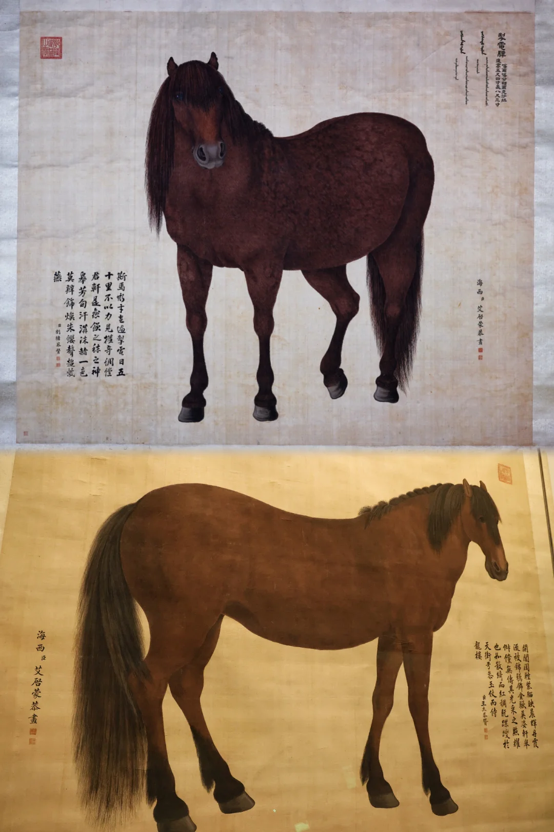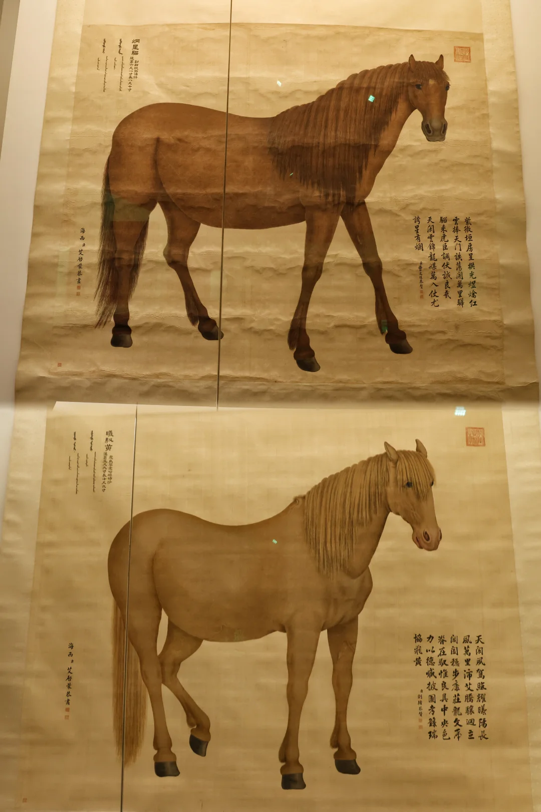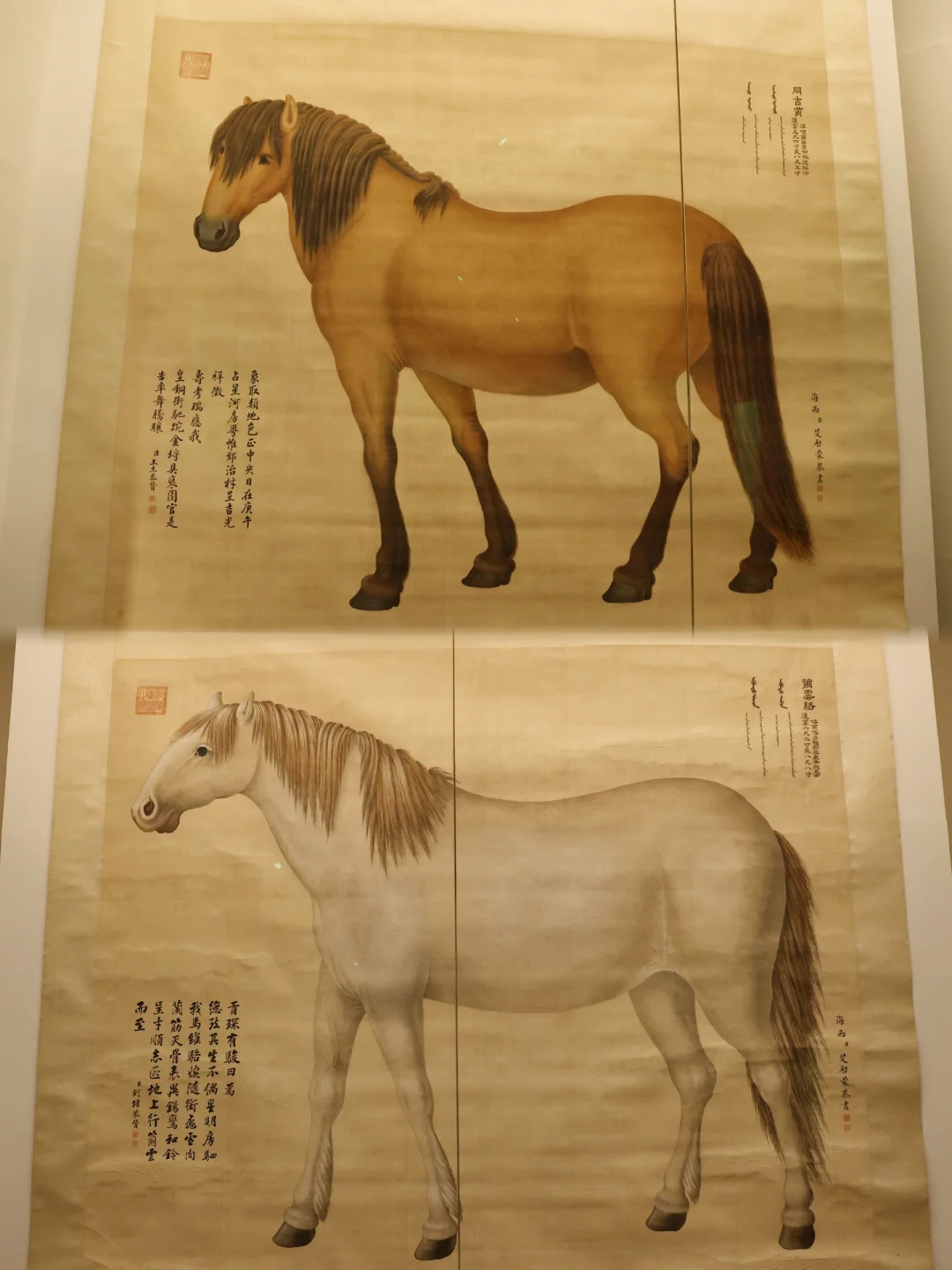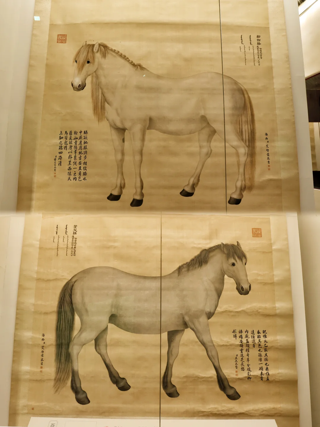 🖼️艾启蒙的【八骏图】无疑是最让人挪不开眼的存在。这位来自波希米亚的宫廷画家,将西洋的写实光影与中式的工笔细腻融于一纸,八匹中亚进贡的宝马与真马等大,每一匹肌肉纹理、皮毛褶皱都清晰可辨,连眼神都透着温润与英气。📸📸(可惜我的拍照技术还是没办法呈现书画的神韵,所以一定要现场来看看)