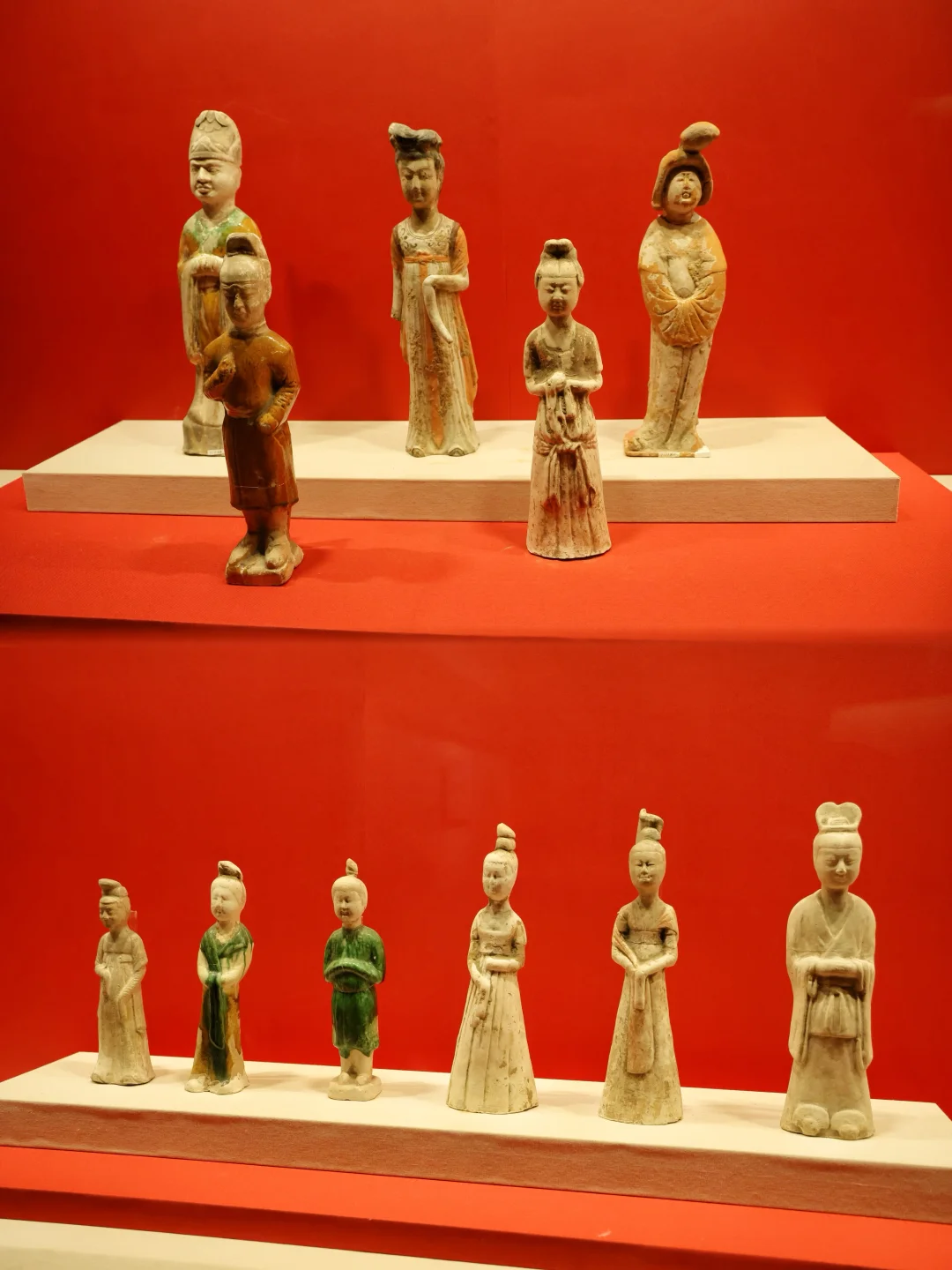 •唐代陶俑群:仕女俑、男侍俑姿态各异,和唐三彩骑马俑一起,拼出大唐长安的生活图景。