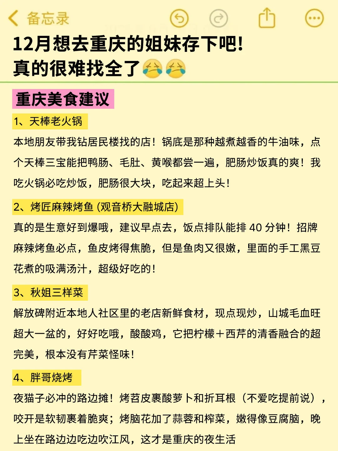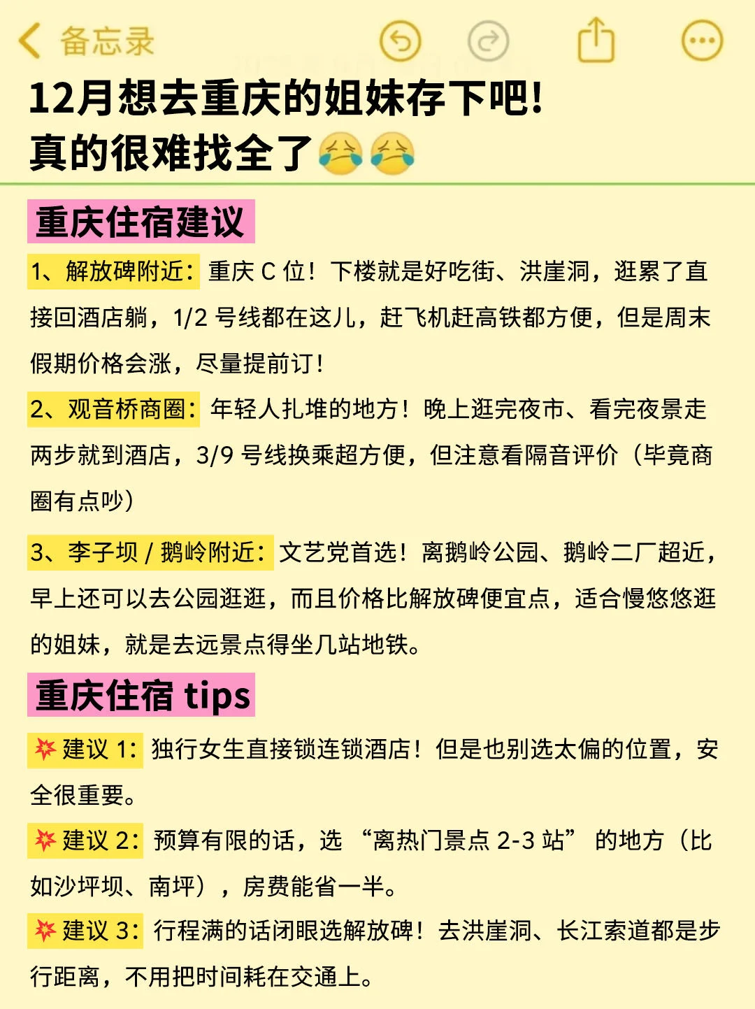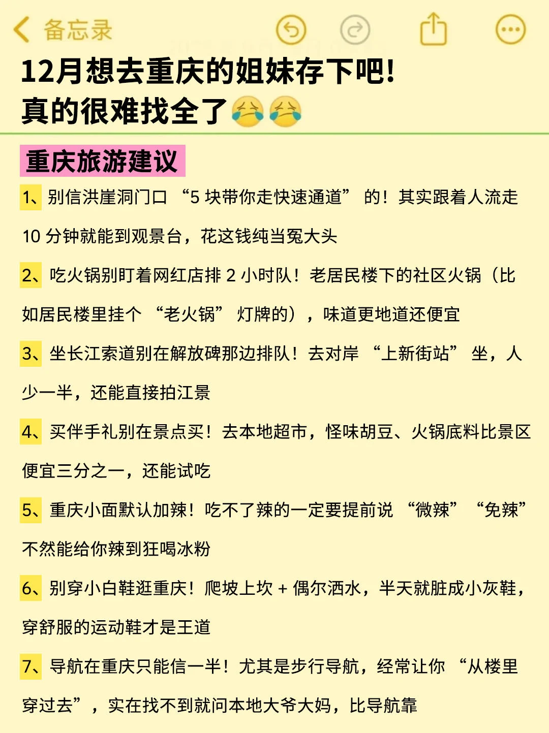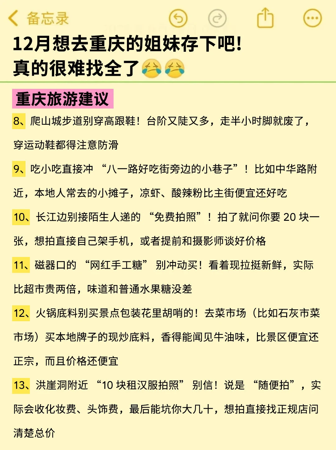 姐妹们,重庆是真的好玩,而且消费也不高,吃吃喝喝有安逸,但是!如果没做好攻略的话,去了真的会踩坑的😤,我把我自己去了好多次总结的经验整理了一下,不敢说是很详细,但是可以参考参考,大家别嫌弃啊🙏