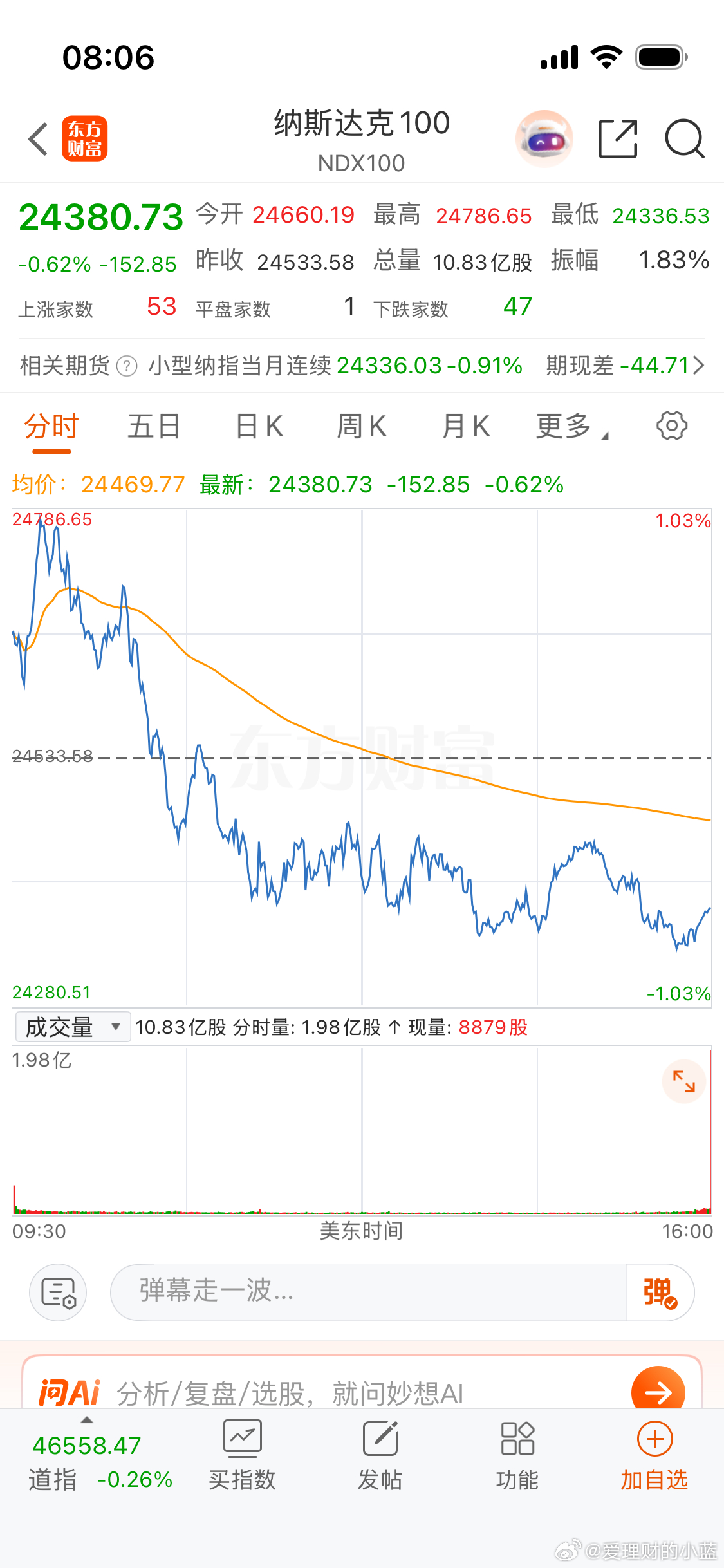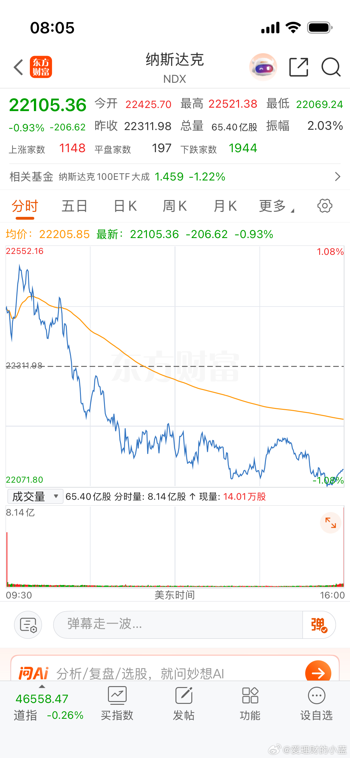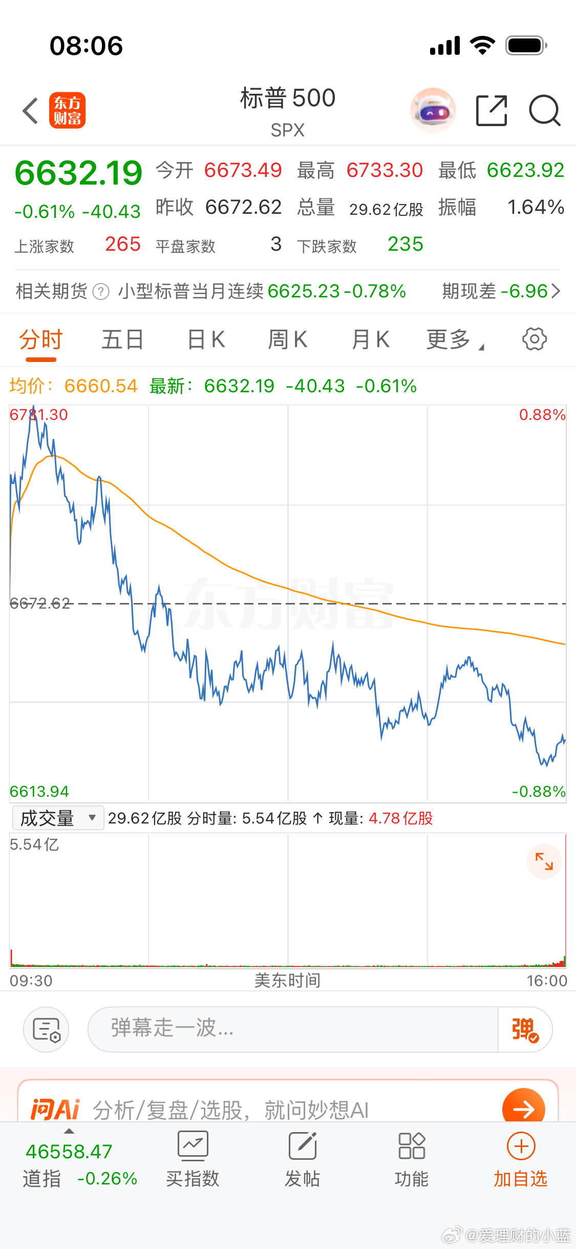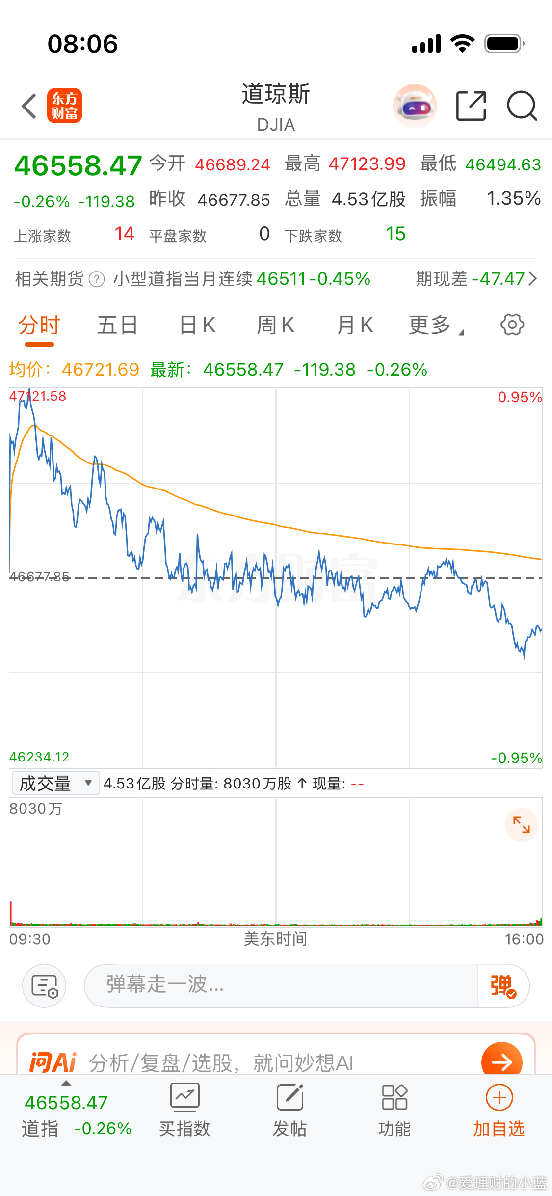 早。美股又大跌1个点。各位上市公司股东们。不要只看不互动播报博主不好做。多转评赞
