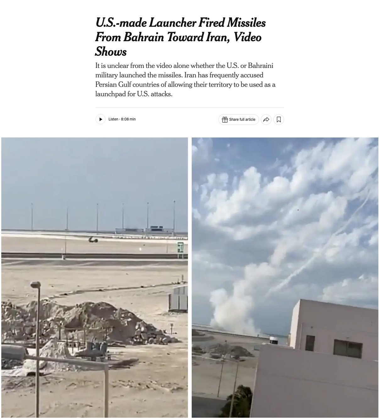 《纽约时报》证实的一段视频显示,巴林向伊朗发射了弹道导弹,可能是从美制海玛斯发射