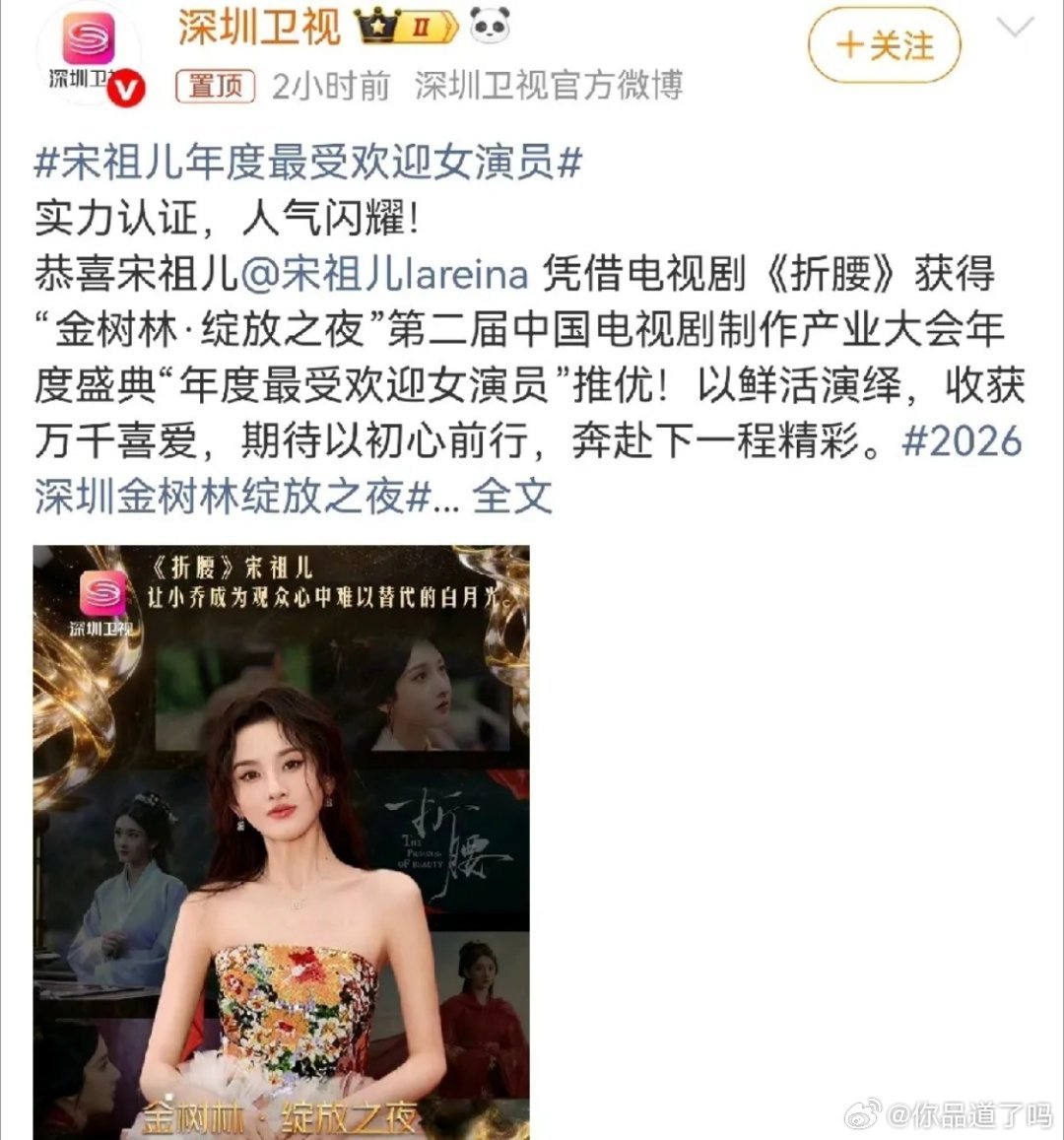 宋祖儿在第二届金树林·绽放之夜盛典上,凭借《折腰》里的小乔一角,拿下了年度最受欢迎女演员大奖!2023年8月,宋祖儿突然被前公司员工实名举报偷逃税4500万,一下子陷入巨大舆论风波。五大卫视连夜删掉她的相关物料,潘婷等代言也火速解约。更惨的是,她手里《折腰》《无忧渡》等好几部S级剧直接被雪藏,事业一夜跌到谷底,还被贴上“税务咖”的标签,被全网质疑。在这之后近两年里,她一直很低调沉寂,配合税务部门核查。最后工作室发声明,证实她并没有偷逃税,只是因为前公司财务遗留问题,补缴了税款和滞纳金共271.69万元,用法律自证了清白。而《折腰》的空降播出,成了她逆风翻盘的关键。这部剧一开播,腾讯站内热度直接破3万,全网热搜超3600个。宋祖儿把聪慧有谋、心系家国的小乔演得特别生动,城楼回眸、隐忍哭戏这些名场面全网刷屏,被观众称为“天选小乔”。这次拿下年度最受欢迎女演员,是观众和行业对她的双重认可,也是她在经历非议、作品被压之后,靠实力挣回来的底气。从被全网质疑的低谷,到凭爆款角色拿奖,宋祖儿终于用作品打破了偏见,也证明了在娱乐圈,扎实的演技和优质的作品,才是最硬的底气。
