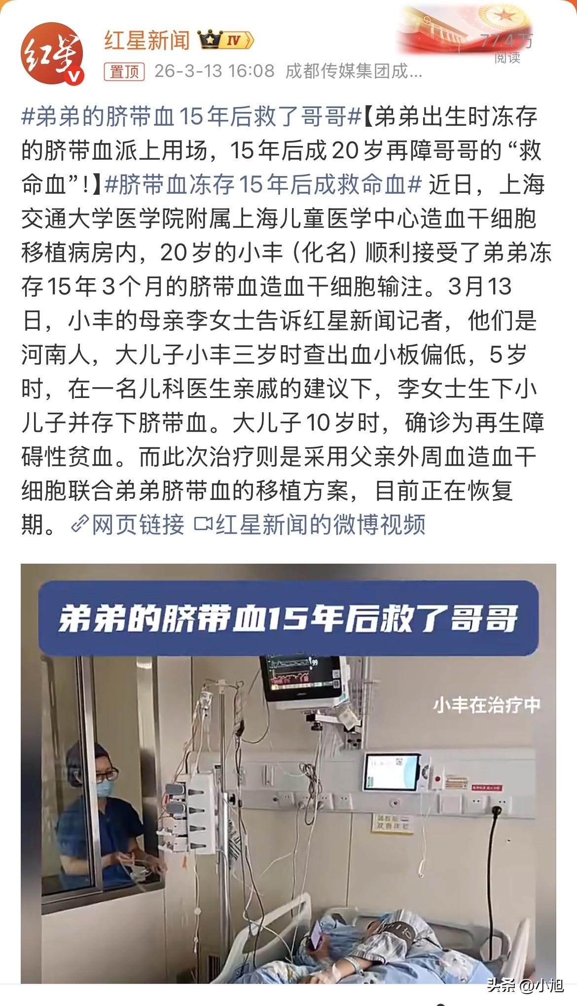 河南安阳的李女士,怎么也没想到,17年前一个亲戚的建议,会在今天给大儿子换来第二次生命。2008年,三岁的小丰因为发烧去医院,查出来血小板低得吓人,但当时医生也说不清到底啥病。李女士心里这块石头,一压就是好几年。 孩子五岁那年,家里当儿科医生的亲戚私下跟她说:趁年轻再要一个,把脐带血存下来。这话说得含蓄,但意思李女士听懂了——这是给老大留个后手。为了存这份血,她怀孕七八个月时专门从河南跑到四川绵阳,那边有脐血库,得提前联系医院。2010年12月,老二在绵阳出生,那管脐带血被小心翼翼地冻存在液氮罐里,温度零下196度。 很多人问过李女士,花这钱值吗?一年近千块的保管费,十几年下来不是小数。但她说得实在:钱没了可以再挣,万一哪天这东西能救老大的命呢。 怕什么来什么。小丰十岁那年,病情终于有了明确诊断——再生障碍性贫血。这病说白了,就是骨髓这个造血工厂彻底停产了,身体会慢慢垮掉。但当时病情还算稳定,一家人就这么小心翼翼地过了好几年。 真正的坎儿出现在大约五年前。小丰开始反复发高烧,病情急转直下,不得不靠输血维持生命。一个大男孩,正该是活蹦乱跳的年纪,却离不开医院。更难得的是小丰自己,学习一点没落下,硬是咬牙考上了上海的大学。 去上海读书,也为后来治病埋下了伏笔。病情越来越重,造血干细胞移植成了唯一的路。配型结果出来,爸爸是半相合,弟弟那份冻存的脐带血也是半相合。单用哪一个,风险都不小。 这里有个专业细节值得说清楚。很多人以为脐带血冻了15年,会不会失效?答案是:在零下196度的液氮里,细胞代谢完全停止,理论上可以永久保存。美国科学家早就研究过,冻存15年甚至更久的脐带血,复苏后活性跟新鲜采集的没啥区别 。国内也有案例,冻存14年的脐血出库时活性还能达到94%以上 。 但关键问题不在这儿。上海的医生团队最后定了个方案:把爸爸的外周血干细胞和弟弟的脐带血,一起输进去。为什么要这么麻烦? 这就是医学上的"亲缘脐血辅助单倍体移植"。通俗点讲,爸爸的干细胞是"主力部队",负责重建整个造血系统;弟弟的脐带血是"精锐辅助部队"。它有个特殊作用——能帮着主力部队在病人体内更快地安营扎寨,还能极大地降低那种要命的排异反应 。 今年3月4号,弟弟那份沉睡了15年的脐带血,在上海的病房里被复苏,一点点输进了哥哥的身体。第二天,爸爸的干细胞也输了进去。 很多人纠结存脐带血到底有没有用,因为自己用上的概率确实不高,统计数据说也就千分之零点几。但这个河南家庭的故事,给出了另一个角度的答案。 李女士存脐带血那年,压根不知道这东西15年后能不能用上。她只是做了一个母亲能做的——给孩子多留一条路。没想到当年那个决定,如今真的成了大儿子的救命稻草。 现在小丰还在移植仓里恢复,等着细胞慢慢长起来,等着过排异这道关。但这束光,已经照进来了。 有人问:当初生老二就是为了救老大,这对老二公平吗? 李女士没回答这个问题。但她当年存脐带血时,老二还没出生。那管血,更像是这个家庭给未来埋下的一个希望。如今希望发芽了,救了老大的命,老二的脐带血也完成了它的使命。 换成是你,会为孩子存这份脐带血吗? 来源:红星新闻
