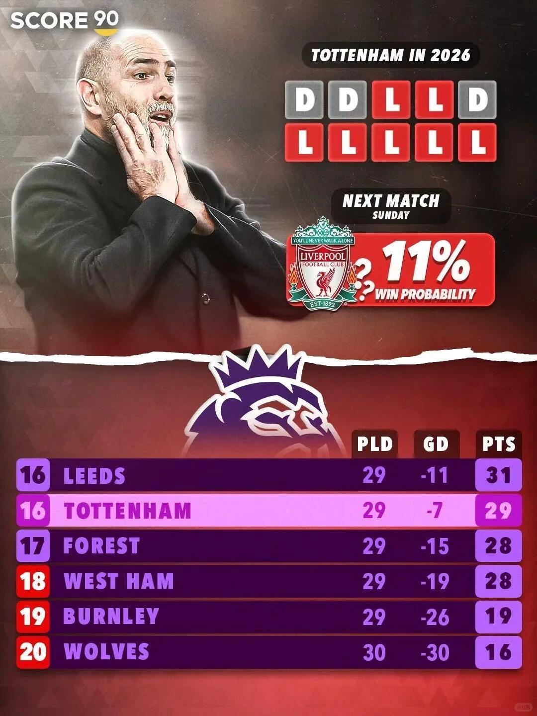 热刺降级概率已经升到37%了!! Score90给出了他们的新一期概率 ,热刺降级的可能性接近4成了。 记得之前还是8%左右的。 现在伯恩利和狼队,已经可以研究英冠的对手了 。热刺、森林和西汉姆联必须下去一个 。之前有传闻,下赛季的英冠附加赛名额增加 ,估计也是为热刺或者西汉姆多留点机会 ,要是再打不上来,就没辙了。 热刺现在10轮不胜,下一场打利物浦, 赢球的可能性只有11%。 再看看球队现在的阵容,也真的是惨 ,伤员一堆。 更麻烦的,我觉得是图多尔, 他简直就是在即兴发挥 。前一晚梦到哪个球员,第二天就派上去。 早知道这样还不如留着弗兰克 ,起码能省一笔钱。