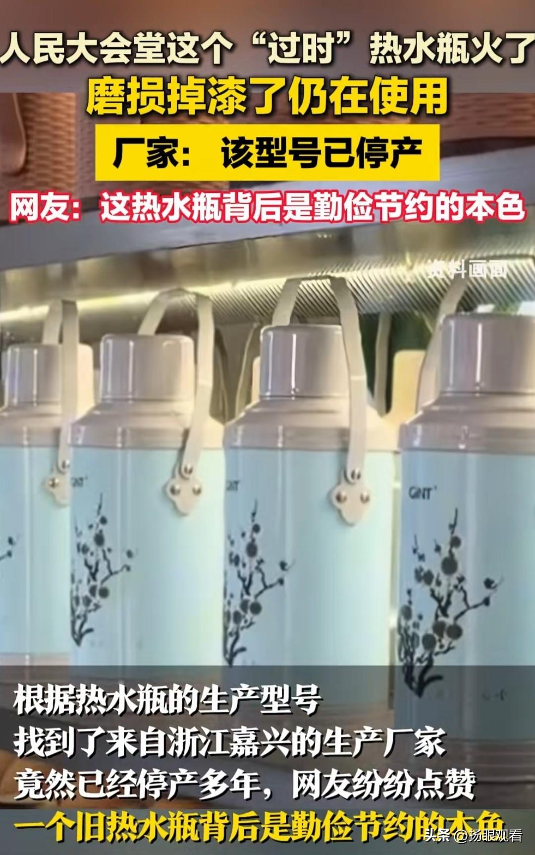 人民大会堂“过气”热水瓶凭实力刷屏🔥 最近全网都在围观一只掉漆热水瓶,本来以为是啥复古网红单品,结果人家是人民大会堂的“资深员工”,凭一身“岁月痕迹”直接火出圈,看完又好笑又好哭! 两会期间这只热水瓶意外被镜头拍到,浅蓝梅花款、瓶身磨得掉漆起皮,关键是人家型号早就停产了,却兢兢业业在岗十几年,主打一个“在岗一分钟,保温六十秒”。本来在年轻人眼里,这种老式热水瓶早就被归为“老土过时”,结果在大会堂里,它就是最硬核的存在。 网友调侃直接笑喷:“这热水瓶比我工龄都长!”“别人拼颜值,它拼耐用度!”而工作人员一句话直接破防:大会一直要求节俭,能用不换、能修不扔,不搞排场、不做面子。合着不是买不起新的,是人家把“节约”刻进骨子里了! 想想现在我们动不动就换新家电,坏一点就直接扔,再看看这只热水瓶,外表斑驳,内心依旧滚烫,装的不只是热水,还是咱们中国人代代相传的勤俭美德。没有奢华包装,没有智能噱头,就靠朴实耐用圈粉无数,这才是真正的“国潮顶流”! 现在全网都在求同款,可惜停产买不到,只能默默为这只“劳模热水瓶”点赞。小物件见大作风,原来最动人的从来不是精致外表,而是这份不忘初心的坚守✨