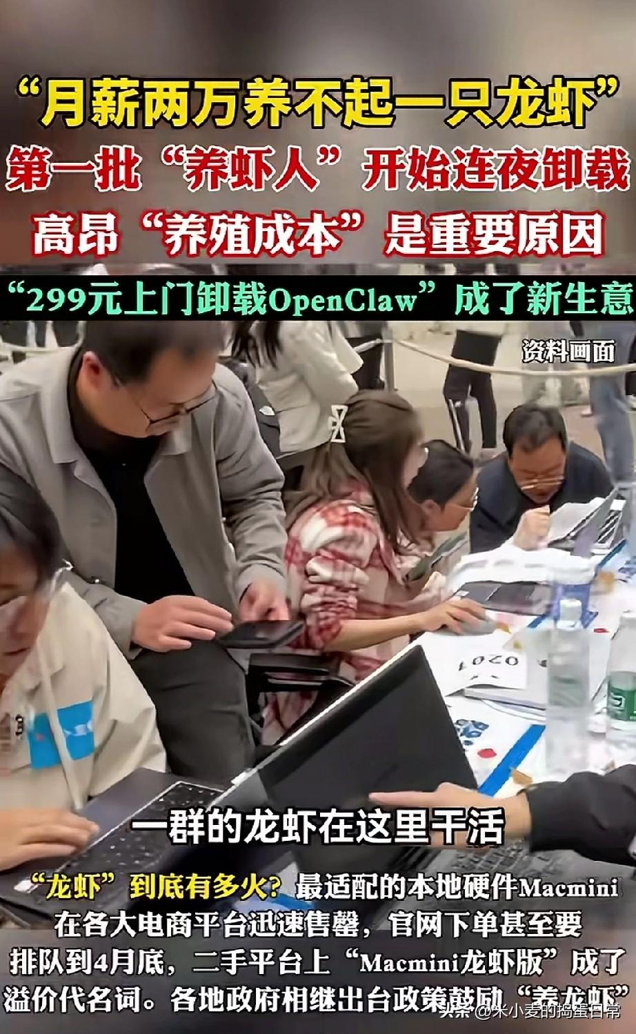 月薪2万养不起一只“龙虾” 第一批养虾人连夜卸载,299元上门“杀虾”生意爆火 前阵子还在疯抢Macmini养“数字龙虾”(OpenClaw)的人,现在已经开始连夜找师傅上门卸载了。这场从“手把手教你养虾”到“手把手帮你杀虾”的魔幻闭环,把AI热潮里的浮躁和焦虑扒得明明白白。 一开始有多疯狂?适配“龙虾”的Macmini在电商平台直接售罄,官网下单要排到4月底,二手平台甚至炒出了“龙虾版”溢价。各地政策鼓励、博主疯狂安利,无数人幻想着靠“雇佣数字牛马”实现躺平暴富,以为只要把代码跑起来,就能躺着收钱。 可现实狠狠给了一巴掌:有人稀里糊涂跑了几个小时,几十块钱就没了;有人看着账单跳涨,崩溃喊出“救命啊我要破产了”。高昂的算力成本、繁琐的部署操作,还有那要接管电脑所有权限的安全顾虑,让“养虾”从致富梦变成了吞金兽。月薪两万的打工人,居然养不起一只虚拟龙虾,这讽刺感直接拉满。 更魔幻的是,有人在“养虾”里亏钱,有人却靠“杀虾”赚得盆满钵满。299元上门彻底卸载OpenClaw的服务横空出世,精准戳中了那些后悔莫及的养虾人痛点——从卖“养虾教程”到卖“卸载服务”,这群“卖铲子的人”完成了完美收割,不管你赚不赚钱,他们永远稳赚不赔。 这事儿说白了,就是又一场跟风热潮的快速幻灭。大家总想着蹭新技术的风口暴富,却忘了任何新事物都有试错成本,更忘了“天上掉馅饼”的背后,往往是早就挖好的坑。与其追着风口瞎折腾,不如沉下心想想:我们真正需要的,到底是能解决问题的工具,还是又一个用来炒作的概念? 你身边有人跟风养“龙虾”吗?对这种299元卸载的生意怎么看?