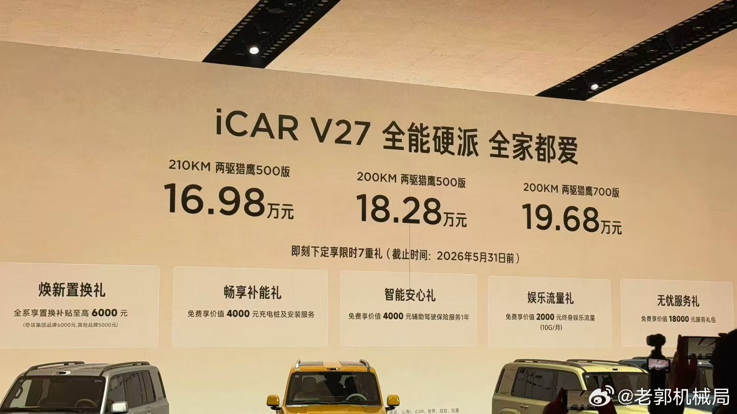 这下比亚迪估计该睡不着觉了,真的,你看奇瑞造的这车,连丰田都直呼内行。我分析了这两年方盒子车型卖的比较好的几个原因,首先就是外观够硬朗霸气,年轻人比较喜欢;其次就是车内空间大坐着舒服,装的东西也多;另外就是底盘高,通过性好,还能轻度越野;最后就是现在的方盒子车大多是纯电或混动,用车成本相对较低。这不,奇瑞今天上市的iCAR V27定位就是硬派风格的中大型SUV,就是经典的方盒子车型。最关键的是它搭配了MRC磁霸悬挂以及i-AWD鬣蜥四驱,要知道这种悬架系统之前只搭载在性能轿车或这跑车上的,这次16万价格的iCAR V27直接安排上了。1.5T增程的动力,用的还是宁德时代的电池,一般只有在问界、特斯拉这种车上才会用,但是,iCAR V27的价格跟他们可不是一个级别的。16.98万的起售价,市场上比较热门的像是坦克300Hi4-T是24.98万、福特智趣烈马是22.98万、钛7也得17.98万。只能说这次的iCAR V27真有点“吓人”。大家觉得这次的iCAR V27会让谁先“失眠”呢?V27全能硬派全家都爱iCARV27全能上市16.98万起
