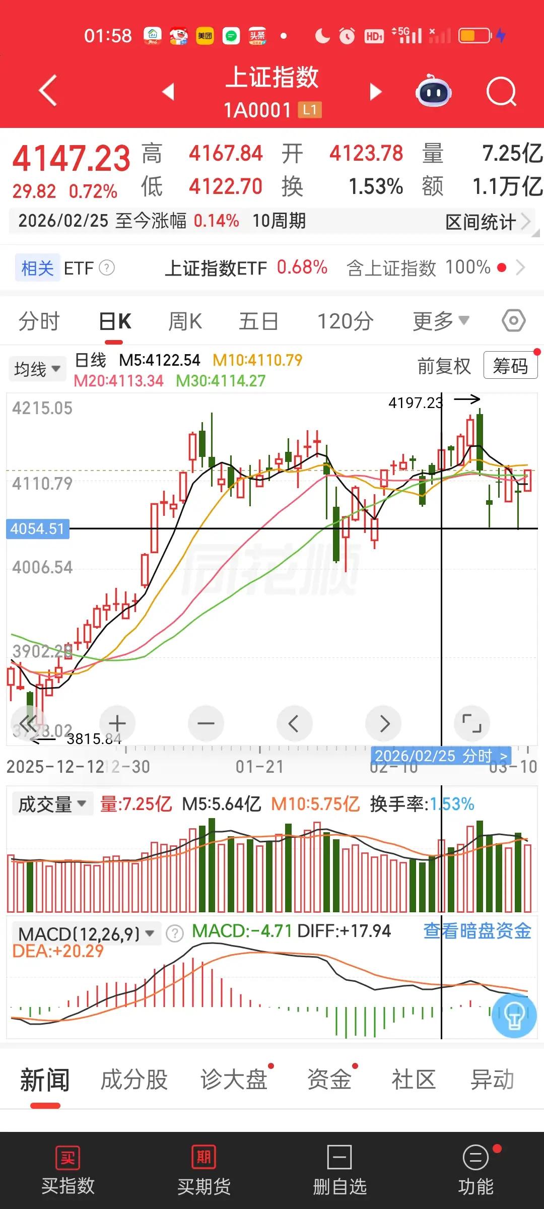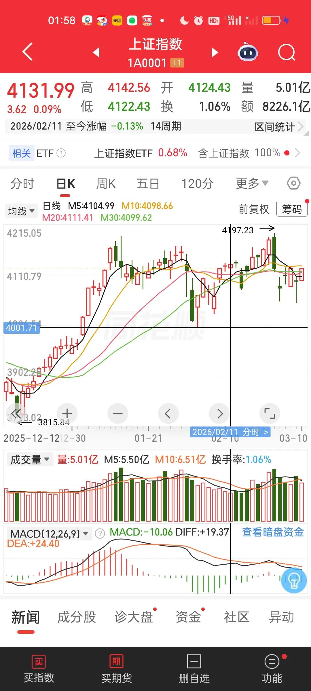 大盘的走势和之前预判的一致。上证指数大概率还会回踩一下60日线也就是4060.61点,当然这个点位下周一可能会抬升到4065点。周五上证指数最低点杀到过4086.85,也就是说向下也只有21个点的空间,硬扛一下是可以的。4065/4086.85=0.9947,其实就差0.53%。收盘4095.45,4065/4095.45=0.9926,60日线距离收盘点位也只差0.74%。 军工和商业航天走势是完全一致的,同涨同跌。板块指数来看没有跌破60日线,但场内ETF周五已经跌破了。前面我们说过商业航天前面涨的太高了,最少需要3个月时间消化,它是1月13日见顶的,理论上最快也需要调整到4月13日,所以周五跌破60日线是很正常的事情,恰恰说明调整远没有结束。从60日线上来最快也要1个月以上,这是深度调整,不是一两个交易日就能调整到位的! 商业航天板块60日线是2401.04,周五收盘2433.39,2401.04/2433.39=0.9867,还有1.33%的空间。军工板块60日线是2575.70,周五收盘是2614.55,2575.70/2614.55=0.9851,距离60日线还差1.49%。所以如果这两个板块下杀到60日线有反抽动作,那场内ETF也将会迎来一次不低于3--4个点的反抽,重仓的朋友可以在这里控一控仓位。因为这两个板块肯定是还没调整到位的。