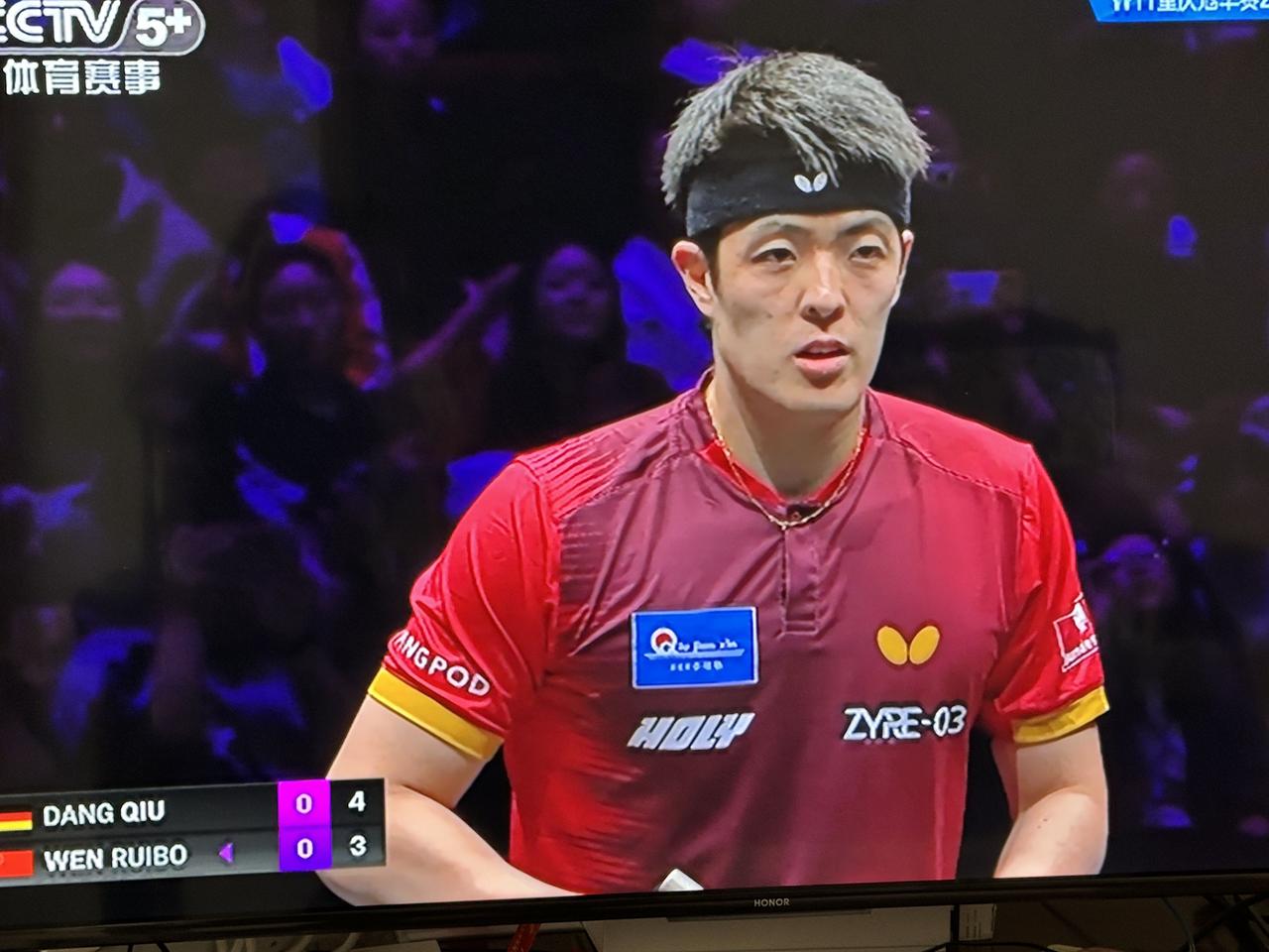 终于可以收看到WTT重庆冠军赛男单四分之一决赛的电视直播了! 这场的对阵双方是中国队19岁的小将温瑞博对阵德国队名将邱党。 第一局比赛,温瑞博初生牛犊不怕虎,倒如猛虎下山一般,势如破竹!以10比4优势分率先拿下一局。他打球的氛围感很强,赢一分就大吼一声,观众席上为他加油的声音也是此起彼伏。 第二局开局温瑞博领先,被追到五比五平时,温瑞博继续领先七比五,八比五,九比五,,邱党一个发球失误10比5,被他连祝贺2分,10比七,11比7,温瑞博又赢下了第二局! 第三局开局,邱党先得一分,二比一,球党继续领先,四比一了,五比一,五比二,温瑞博喊起来了!六比二,六比三,七三,7比4,八比四,温瑞博这局有点被动了。八比五,八比六,九比六,九比七,10比七,邱党拿到了这局的局点,10比9,邱党这边叫了暂停。 精彩还在继续!暂停回来,温瑞博发球比分追到10比10,10比11,温瑞博反超一分,12比10,温瑞博逆转拿下了第三局的胜利,可喜可贺!大比分三比零领先,再赢一局呀! 第四局开局邱党先得一分,温瑞博马上追上一分,邱党又得三分,比分到了四比一,五比一了,温瑞博别急,稳住!六比二,六比三,六比四,温瑞博出球还是很果断,此时出现了一个小插曲,可能认为这个球打坏掉了,裁判长判定这个分算数。六比五,七比五,邱党暂时领先,八比五, 八比六,八比七,九比七,九比八,10比8,邱当拿到了局点,11比8,邱党拿到了第四局的胜利,目前大比分三比一,温瑞博,精彩还在继续。