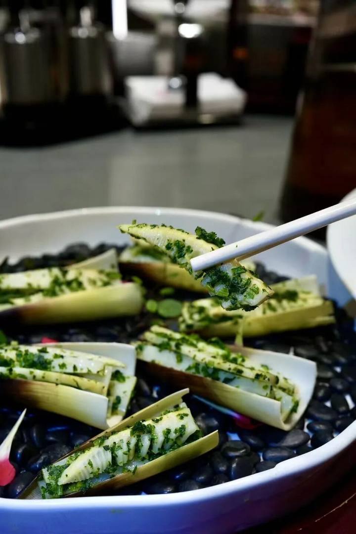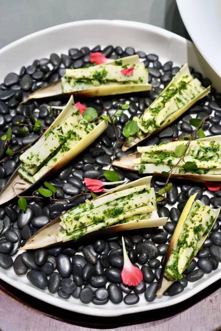 荠菜凉拌春笋尖,一道凉菜,春笋切丝,香油凉拌荠菜末,以笋壳做碗托,江南雅韵,和盘托出。
