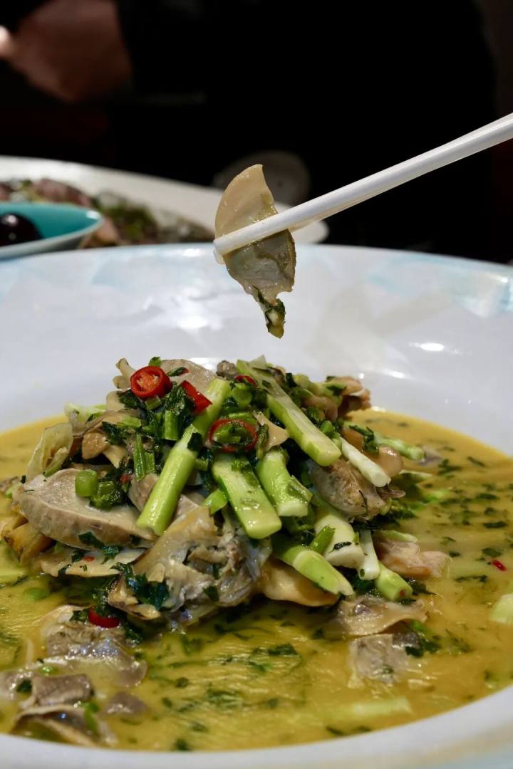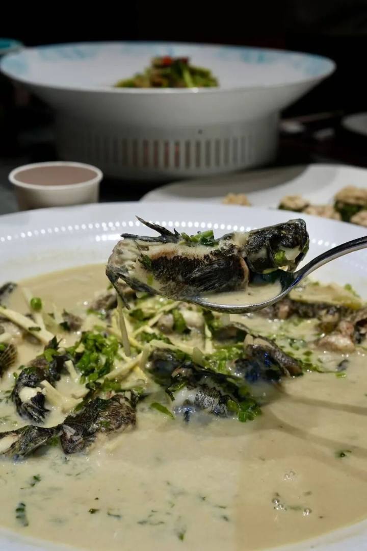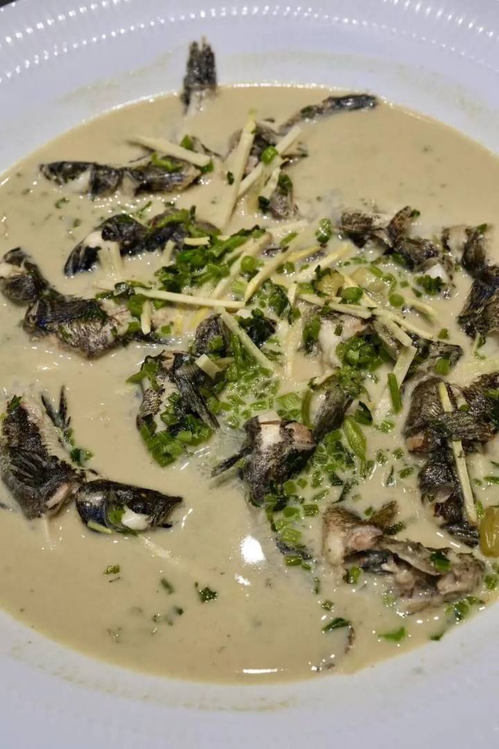 半汤的雪菜春笋土步鱼是后来演变来的,传统老底子杭派烹制土步鱼,并不见汤,先将土步鱼上浆锁水,再猪油润锅,滑油煸炒,复下姜片雪菜炒香,最后成菜只见芡汁不见汤。