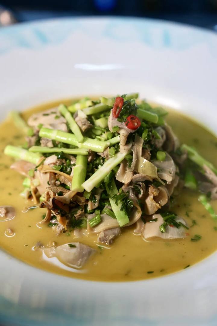 青雪菜切丁烧地衣,滗出一汪鲜汤。