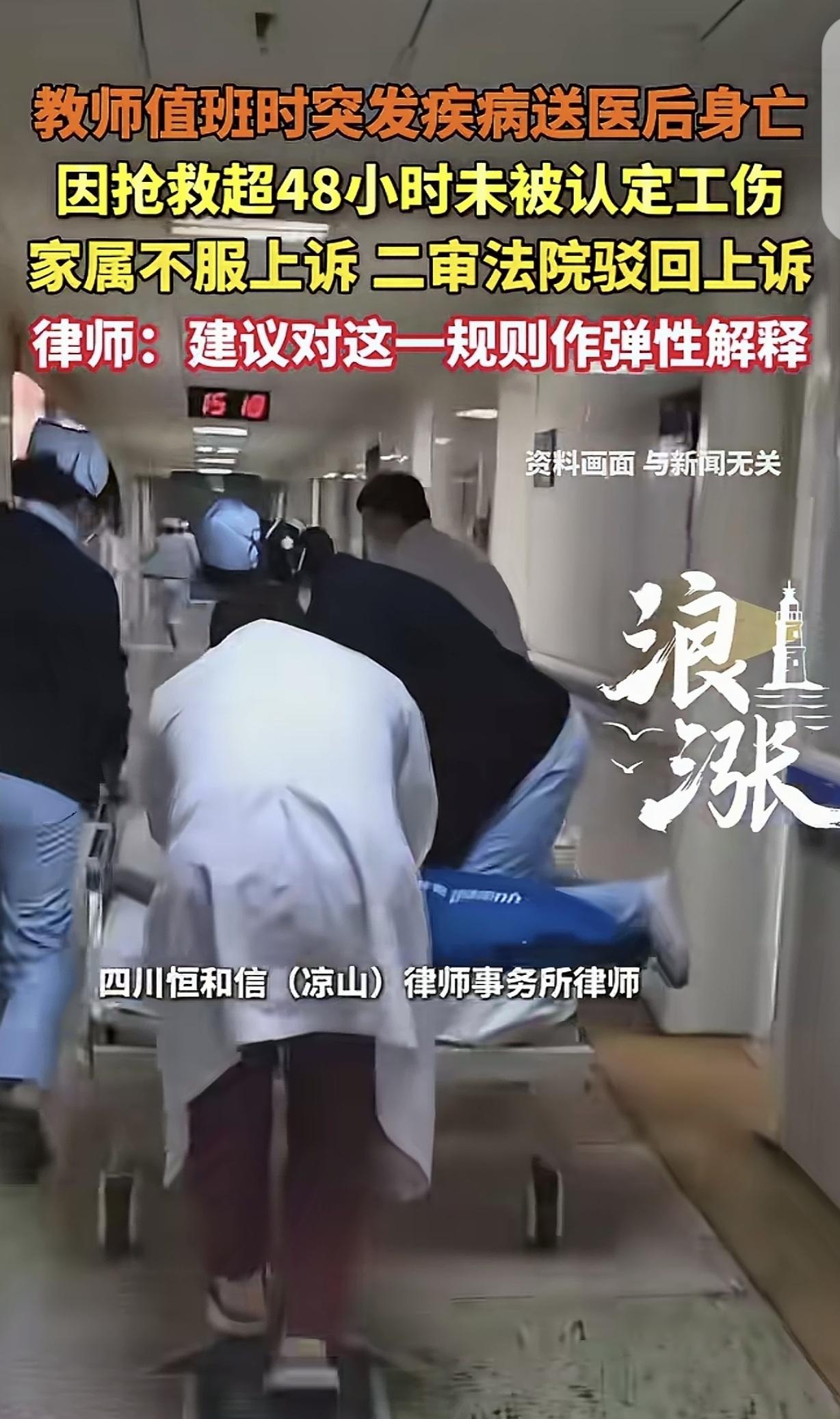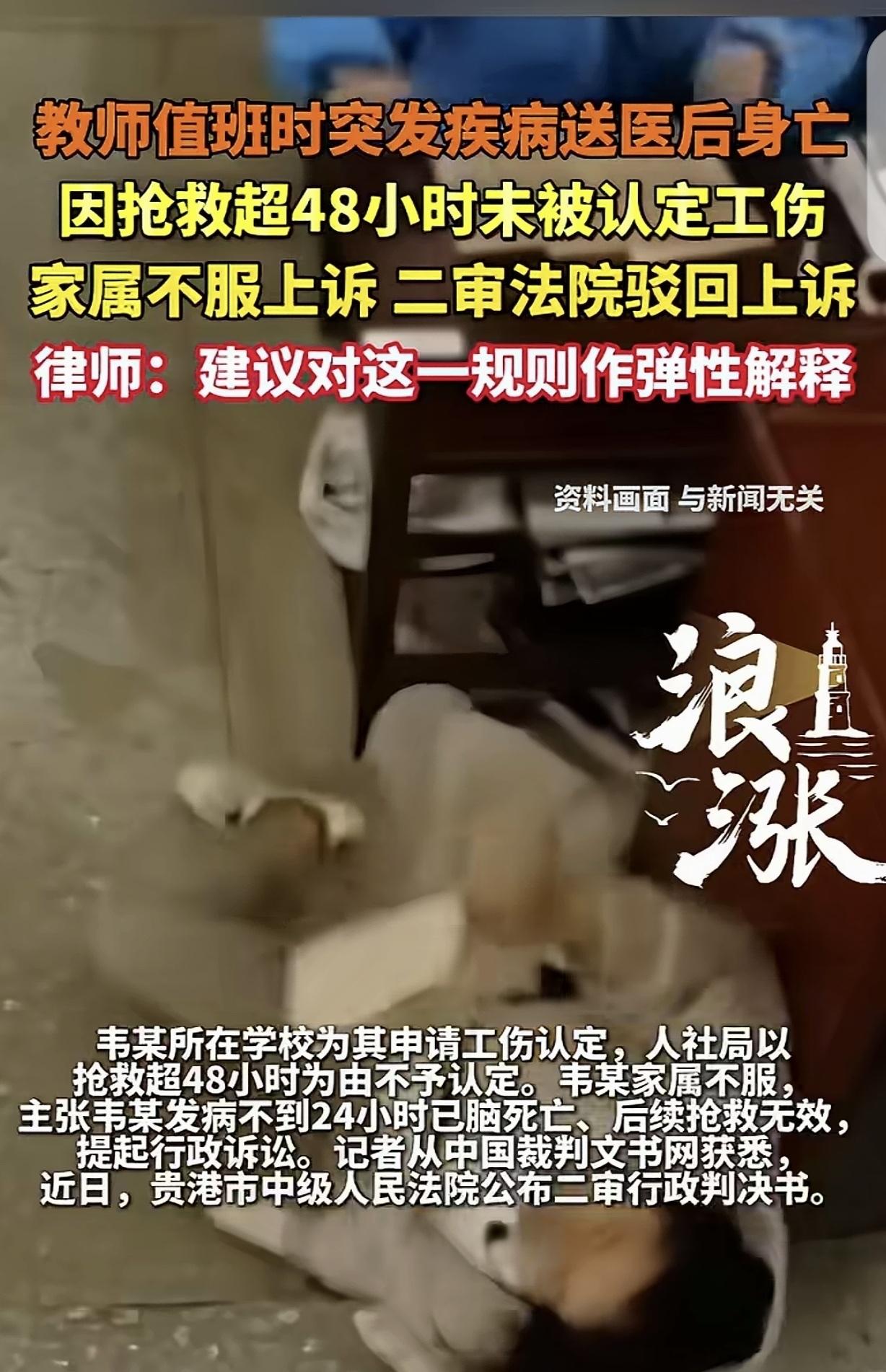 广西贵港,一女老师值班时,突然发病晕倒,送到医院做了开颅手术,人其实已经不行了,但是家属坚持抢救,最后只能用药物和机器维持生命,74小时后,女子还是抢救无效死亡。申请工伤保险赔偿时,却因抢救时间过长被拒,家属直接告到法院,判决结果让人意难平,律师:建议修改法律标准!   事情发生在2025年5月30日中午。   当天,韦某在学校值班,后来被人发现倒在卫生间里,已经失去意识。   同事马上拨打急救电话,把人送到医院。   医院接诊后很快判断情况危急,检查结果指向严重脑出血,出血部位在左侧丘脑一带,还波及脑室。   当天,医生就给她做了开颅清除血肿和引流手术。   手术做完,人并没有清醒过来。   后面的几次查房记录,都在往一个不太好的方向发展。   5月31日上午,医生观察到她瞳孔散大固定,没有自主呼吸。   6月1日和6月2日,病情记录依旧没有明显转机,主要靠呼吸机辅助,加上大量药物维持生命体征。   医生持续向家属说明风险,病情随时可能进一步恶化,脑干功能衰竭后,出现血压下降、心跳停止的可能性很高。   家属没有放弃。   在重症监护室外,家里人选择继续抢救,只想把那一点点希望再留久一点。   一直到6月2日下午,情况还是到了最坏的一步。   当天下午3点15分左右,韦某出现心跳骤停。   经过抢救,到下午3点45分,医院确认临床死亡,并出具了相应医学证明。   从发病到死亡,合计74小时。   学校随后为她申请工伤认定。   按很多人的直觉,这件事发生在值班期间,人又是在工作场所出事,后续治疗也一直没有中断,申请工伤看起来并不突兀。   问题卡在一个很多人平时不会注意的时间门槛上。   现行规定里,职工在工作时间和工作岗位突发疾病,死亡,或者在48小时内经抢救无效死亡,可以视同工伤。   韦某虽然符合在工作时间、工作岗位发病这一点,临床死亡时间却落在48小时之外。   人社部门据此作出不予认定决定。   家属不认可这个结果。   他们提出的核心观点很明确,韦某在发病后不到24小时,实际上已经出现脑干功能严重受损,后面两天只是依靠机器和药物维持,按实质状态看,生命已经无法逆转,不该只盯着最后的心跳停止时间。   围绕这个问题,官司一路打到了二审。   法院审理时,重点还是落在证据上。   医院病程记录、死亡记录、居民死亡医学证明,都把死亡时间明确写在6月2日下午。   从司法认定角度看,死亡时间属于专业判断事项,法院通常要尊重医疗机构结论。   家属提出的脑死亡说法,还缺少足以单独支撑认定的医疗证据。   尤其是6月2日上午的查房记录里,生命体征仍然存在,这也让家属关于48小时内已经死亡的主张难以成立。   一审没有支持家属请求。   家属继续上诉。   二审维持原判。   这起案子引起关注,不只是由于一位老师倒在岗位上,更在于它碰到了一个很现实的难题。   从法律执行看,48小时是一条清晰边界,便于认定,也有利于统一尺度。   从家属处境看,人还在重症监护室里,心跳还在监测仪上显示,几乎没人会主动在那个时刻去算一笔待遇账。   很多法律人士也提到,这类案件最让人难受的地方,是抢救和认定之间容易形成一种拧巴局面。   继续救,人可能救不回来,认定也可能落空。   不继续救,家属心理上又很难过得去。   这也是脑死亡标准屡屡被提起的原因。   现代医学里,脑死亡早就不是陌生概念,它指向的是全脑功能不可逆丧失。   问题在于,脑死亡要进入具体法律适用,不能只靠家属感受,也不能靠模糊判断,往往需要严格程序、专业资质和明确标准。   放到工伤认定里,难点更明显。   一边是规则要稳定,一边是个案里的人情和医疗现实。   这些年,围绕48小时的争议并不止这一件。   有的案件里,法院对抢救过程、转院时间、脑死亡证据作了更细处理,结论也会不同。   大多数情形下,裁判还是更倾向按临床死亡时间来计算。   说到底,这件事最让普通人记住的,不是法条写了哪几个字,而是那74个小时里,家属一直守着一个也许已经非常渺茫的希望。   人躺在病床上,机器还在运转,谁也很难轻易说出停下这两个字。   案子已经判完了,结果没有改变。   留给外界的提醒却很直接。   工作中的突发重病,后续认定往往看证据,也看时间点。   对家属来说,治疗期间尽量保存完整病历、查房记录、抢救经过和岗位材料,真到了要维权的时候,这些东西比情绪更有分量。   对普通上班的人来说,身体发出的信号,也别总拖着不当回事。   有些风险一旦发生,后面面对的就不只是抢救,还有漫长的现实问题。
