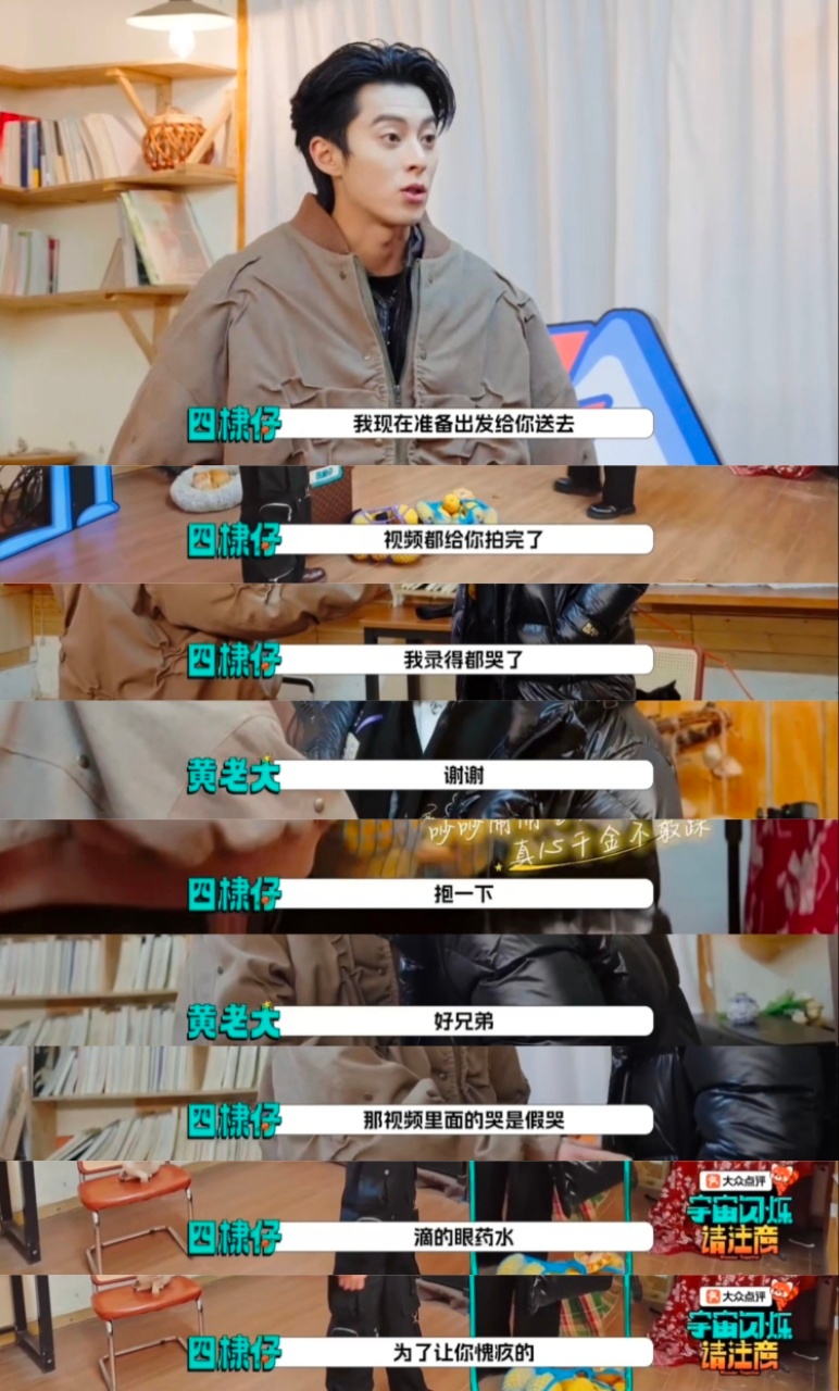 王鹤棣假哭骗过影帝黄晓明宇宙闪烁请注意 节目互送木瓜环节,王鹤棣搞怪不停,先后骗了黄子韬、黄晓明和邵子恒,手动打造出搞笑的四角恋场景。黄晓明察觉被耍正要生气,王鹤棣用一段嗷嗷哭的视频化解危机,边哭边感谢黄晓明的照顾,称之前都是节目效果,黄晓明感动拥抱后,他才承认是假哭,还提到用了眼药水。