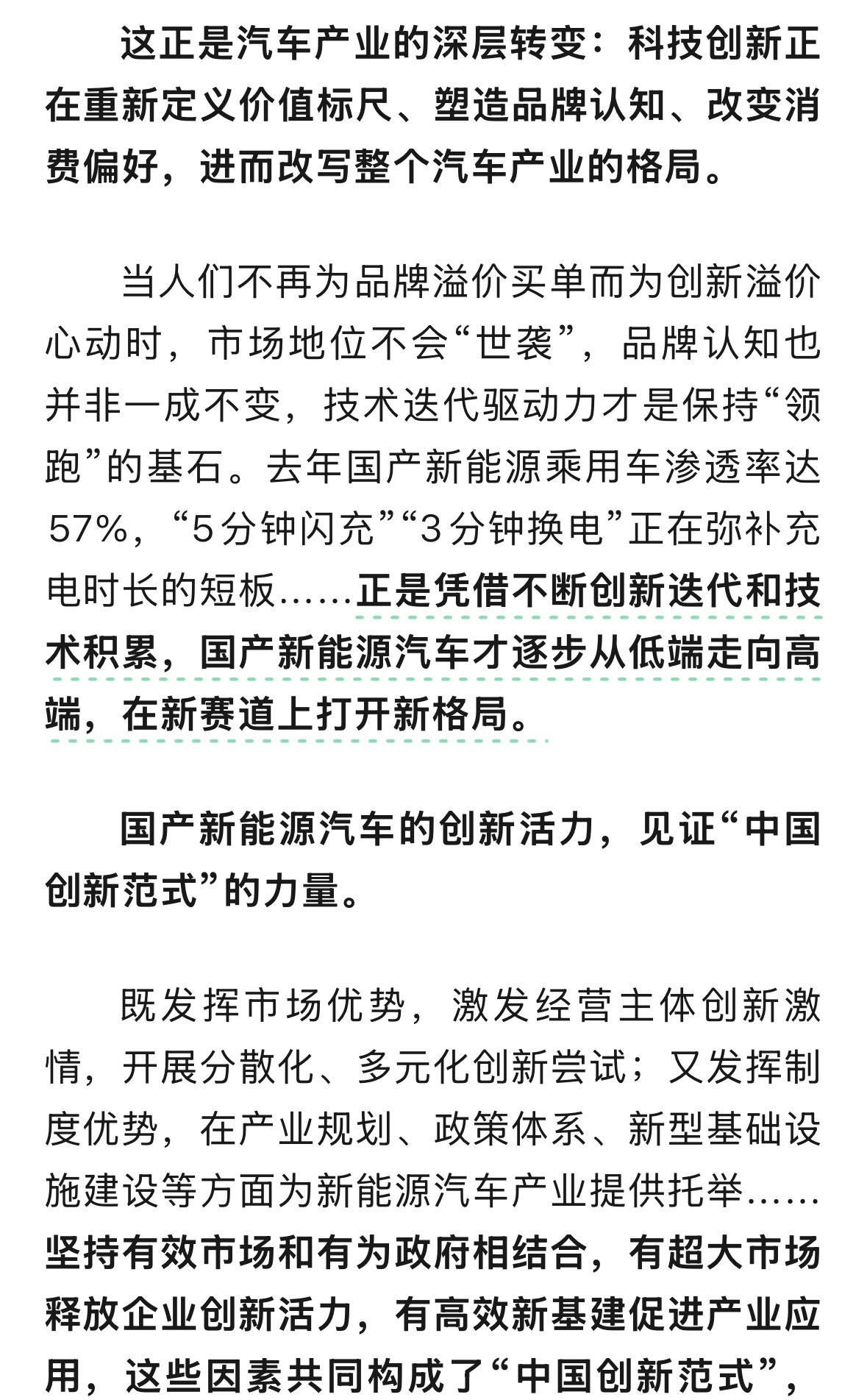 人民日报评论:当人们不再为品牌溢价买单而为创新溢价心动时,市场地位不会“世袭”,品牌认知也并非一成不变,技术迭代驱动力才是保持“领跑”的基石。去年国产新能源乘用车渗透率达57%,“5分钟闪充”“3分钟换电”正在弥补充电时长的短板……正是凭借不断创新迭代和技术积累,国产新能源汽车才逐步从低端走向高端,在新赛道上打开新格局。