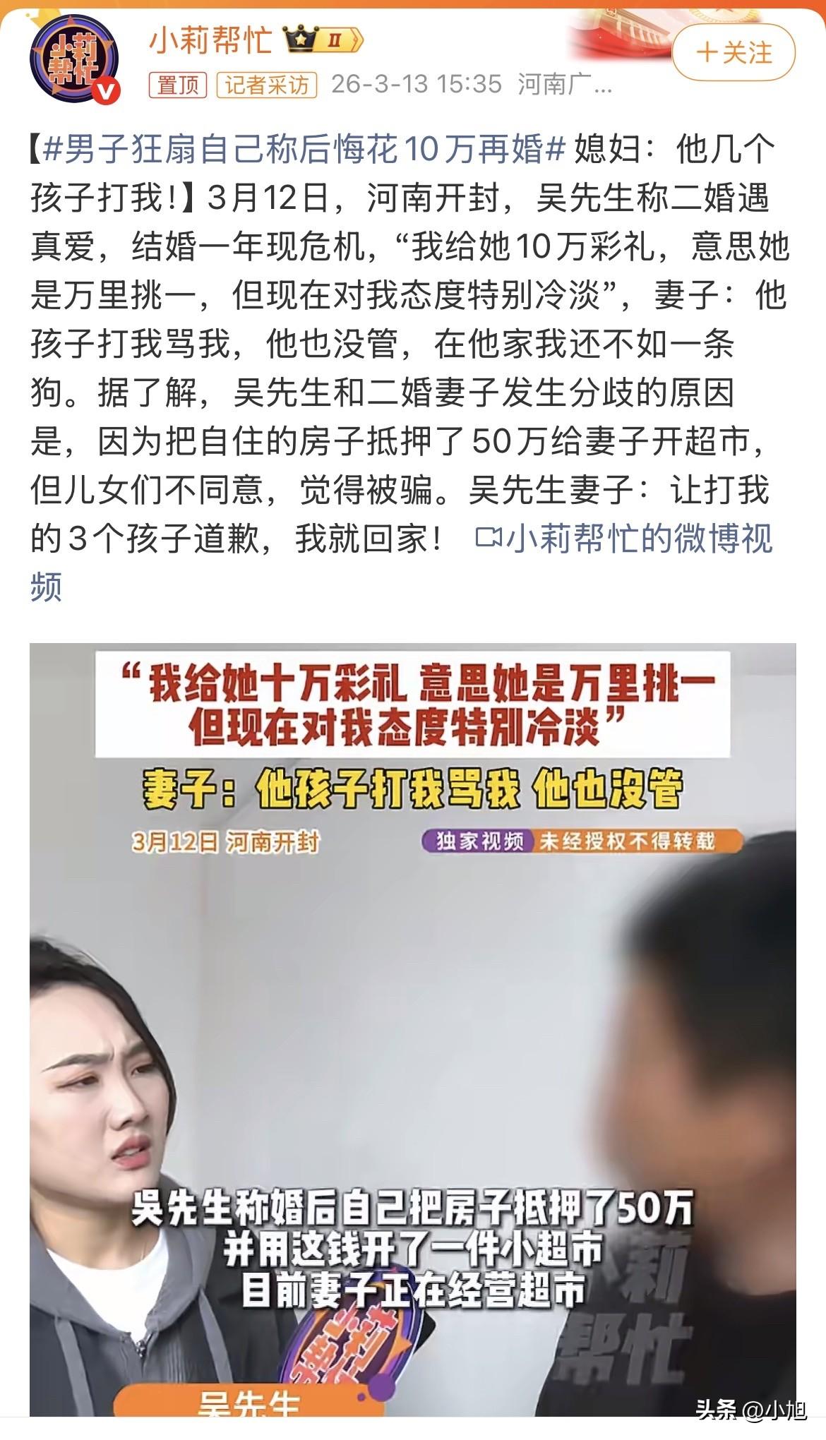 河南这大哥,对着镜头扇自己耳光那段,真是看得人心里五味杂陈。五六十岁的人了,脸都扇肿了,哭得一把鼻涕一把泪,说自己花了十万块娶的二婚媳妇,现在对他特别冷淡,他后悔啊 。 可镜头一转,他那媳妇说的完全是另一个版本。女的眼圈红着,声音都在抖:他家那几个孩子,动手打我骂我,他就在旁边看着,屁都不放一个。我跟他结婚这一年,在他家还不如一条狗 。你看,男人觉得给了钱就是真爱,女人觉得挨了打就是没爱,这账本从一开始就是乱的。 这事儿闹这么大,是因为一套房子。吴先生为了证明自己是真心,也为了让媳妇高兴,把现在住的那套房子抵押了,贷出来五十万,给媳妇开超市 。可这房子是他跟前面那个老婆攒下的,他前头的儿女一听就炸了,坚决反对,觉得这女的肯定是来骗钱的 。 这下好了,爹被夹在中间。一边是枕边人,天天说想创业想过好日子;一边是亲骨肉,天天念叨爸你别让人骗了。最后超市开没开起来不知道,家是先散了。男的觉得儿女不理解他,女的觉得老公不护着她,儿女觉得后妈就是祸害。 这媳妇后来也放话了,对着镜头说得清清楚楚:我也不图你家产,让那几个动手打我的孩子,当面给我道个歉,我就回去继续过日子 。她争的其实不是那十万块钱,也不是那套房子,争的就是一口气,一个在这个家里该有的尊重和地位。 其实仔细想想这女的说的这句话,信息量挺大的。她说的是让打我的三个孩子道歉。这说明什么?说明当时那个冲突,不是简单的拌嘴吵架,是动了手的。而且不是一个孩子冲动,是三个孩子一起。当爹的当时在哪儿?是不是真像她说的,就在旁边看着没管? 这事儿说到底,就是个重组家庭的死结。当爹的脑子是糊涂的,觉得给钱就是爱,花钱就能买太平。当儿女的心是提着的,总觉得后妈进门就是冲着财产来的。当后妈的心是凉的,觉得我嫁过来就是受气的。 没人问问那五十万投进去的超市现在到底是个什么情况,是赚了还是赔了。也没人看看这一地鸡毛里,那个在镜头前扇自己耳光的男人,他到底是真的知道错了,还是只是后悔花了钱没买到想要的热炕头。 家人们,你们摸着良心说,让那三个动手的孩子道个歉,这个要求过分吗?这场二婚的烂账,到底该谁先低这个头? 来源:小莉帮忙