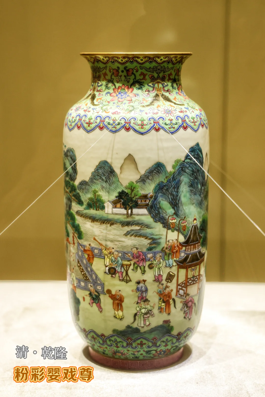 【粉彩婴戏尊】满工彩绘山间婴戏图,孩童敲锣打鼓热闹非凡,粉彩设色明艳却不俗气,尽显乾隆朝的繁华热闹。