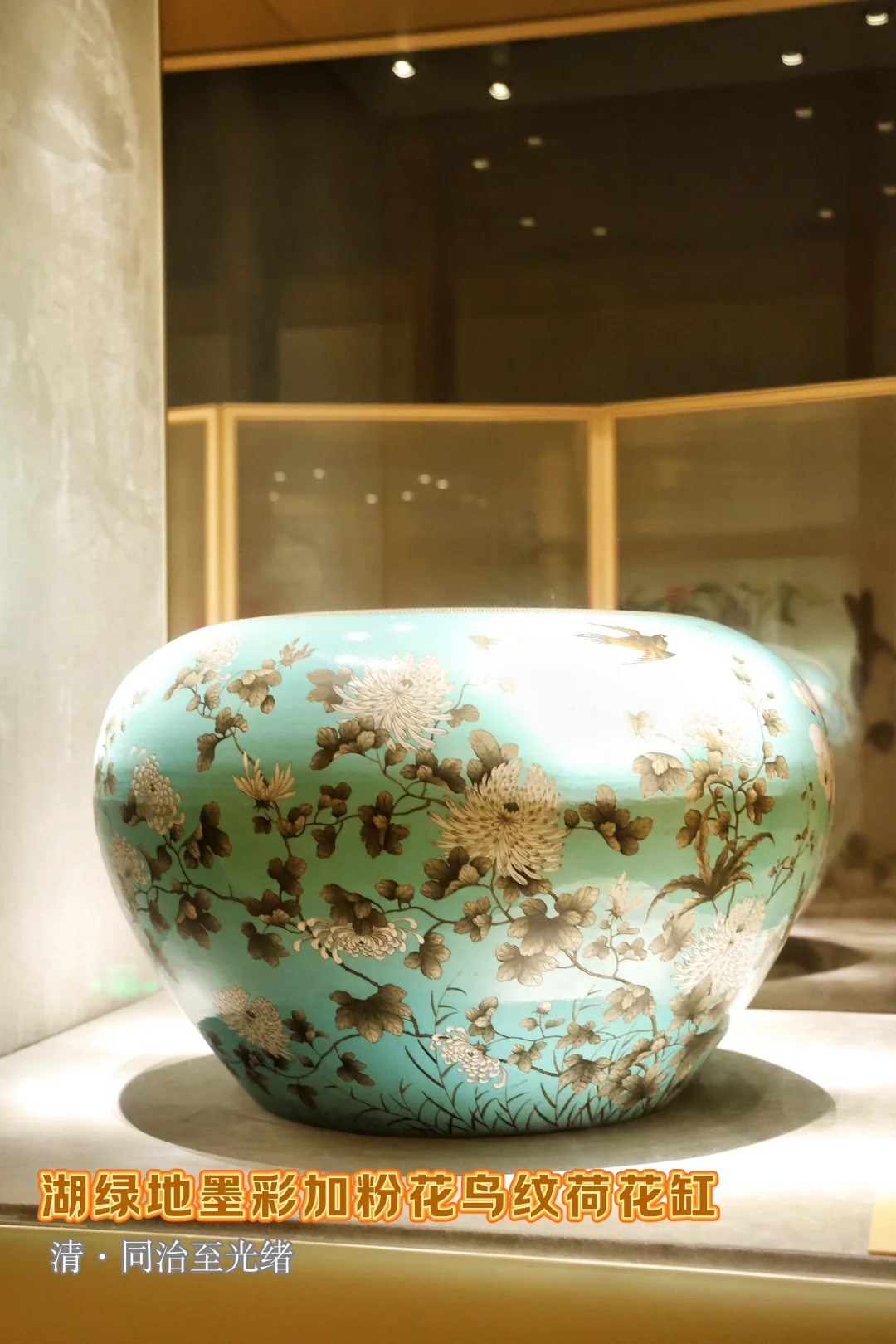 【湖绿地墨彩加粉花鸟纹荷花缸】同治光绪年间的大件器物,湖绿底衬墨彩菊花与飞鸟,清新雅致,是晚清瓷艺的温柔余韵。