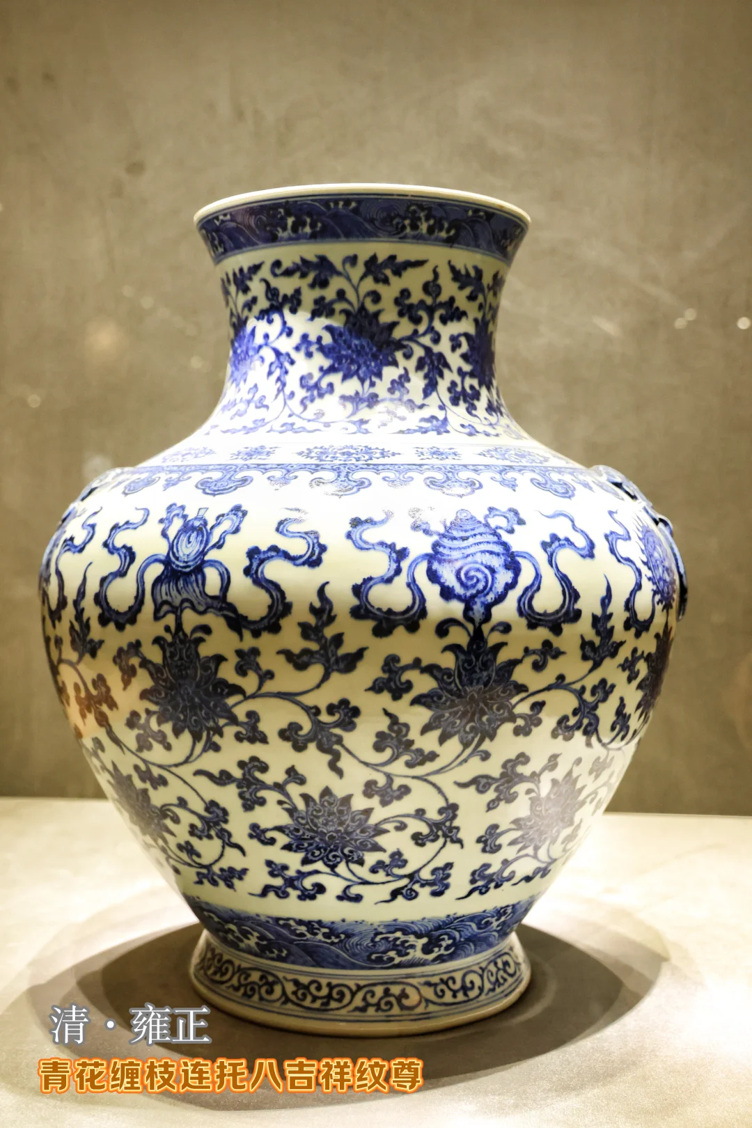 【雍正青花缠枝莲托八吉祥纹尊】青花发色沉稳,缠枝莲与八吉祥纹层层递进,器型饱满大气,是雍正朝“雅致极简”的代表。